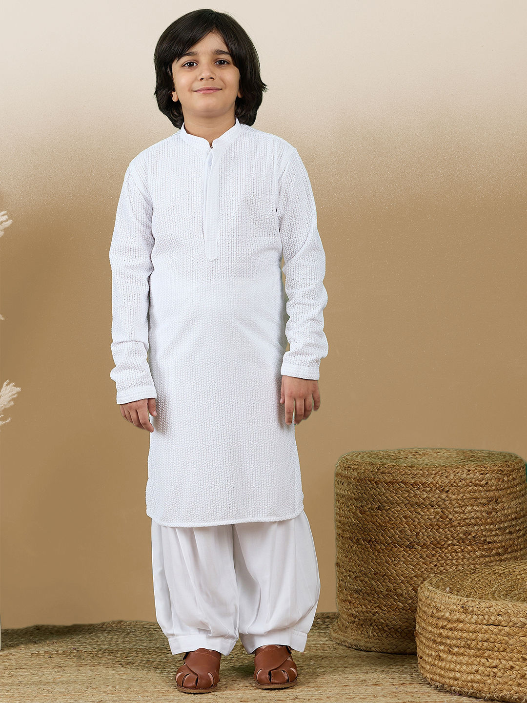 White and Off White color Boys Kurta Pyjama in Cotton fabric with Embroidered work