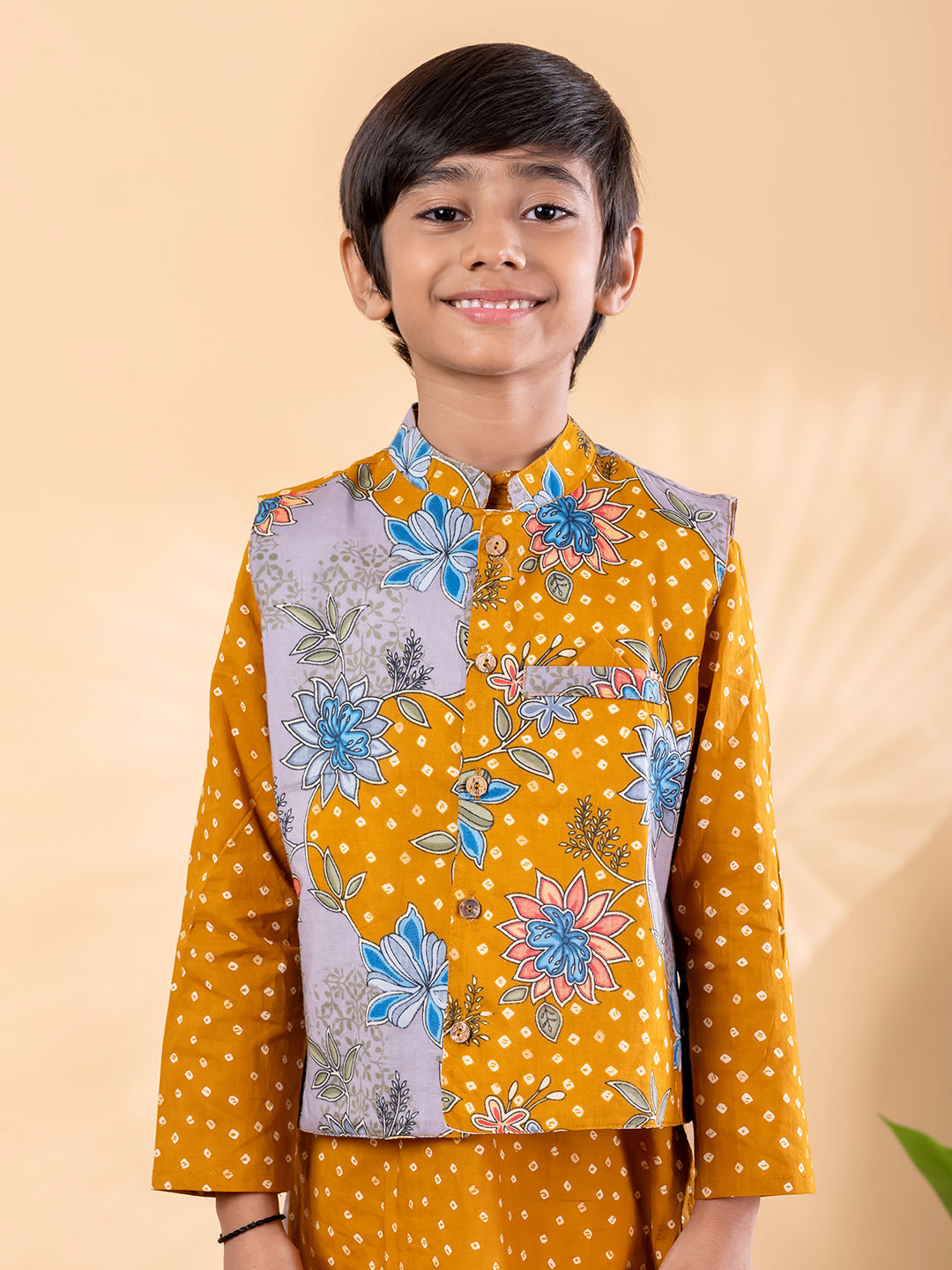 Black and Grey, Yellow color Boys Kurta Pyjama with Jacket in Cotton fabric with Floral, Printed work