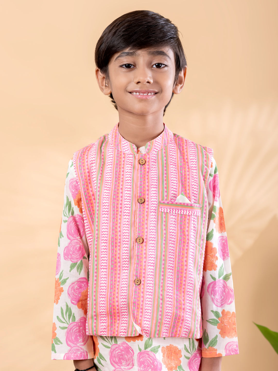 Cotton Festive Boys Kurta Pyjama with Jacket in Pink and Majenta with Floral work