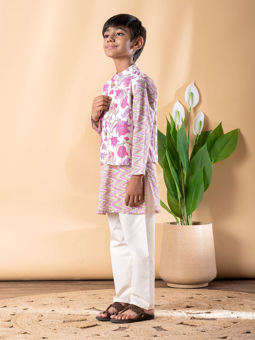 Cotton Festive Boys Kurta Pyjama with Jacket in Pink and Majenta with Printed work