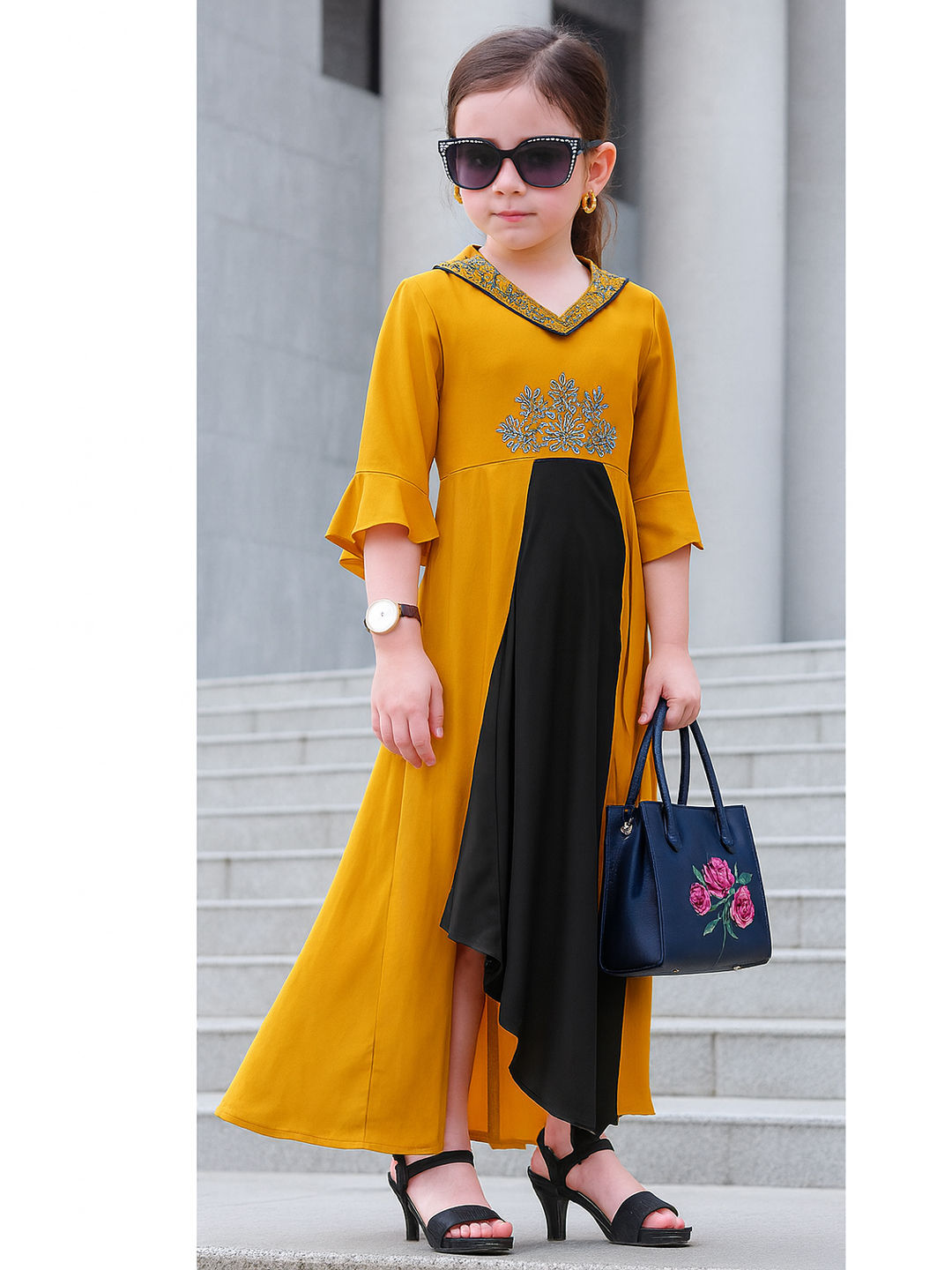 Yellow color Girls Gown in Cotton, Rayon fabric with Embroidered work