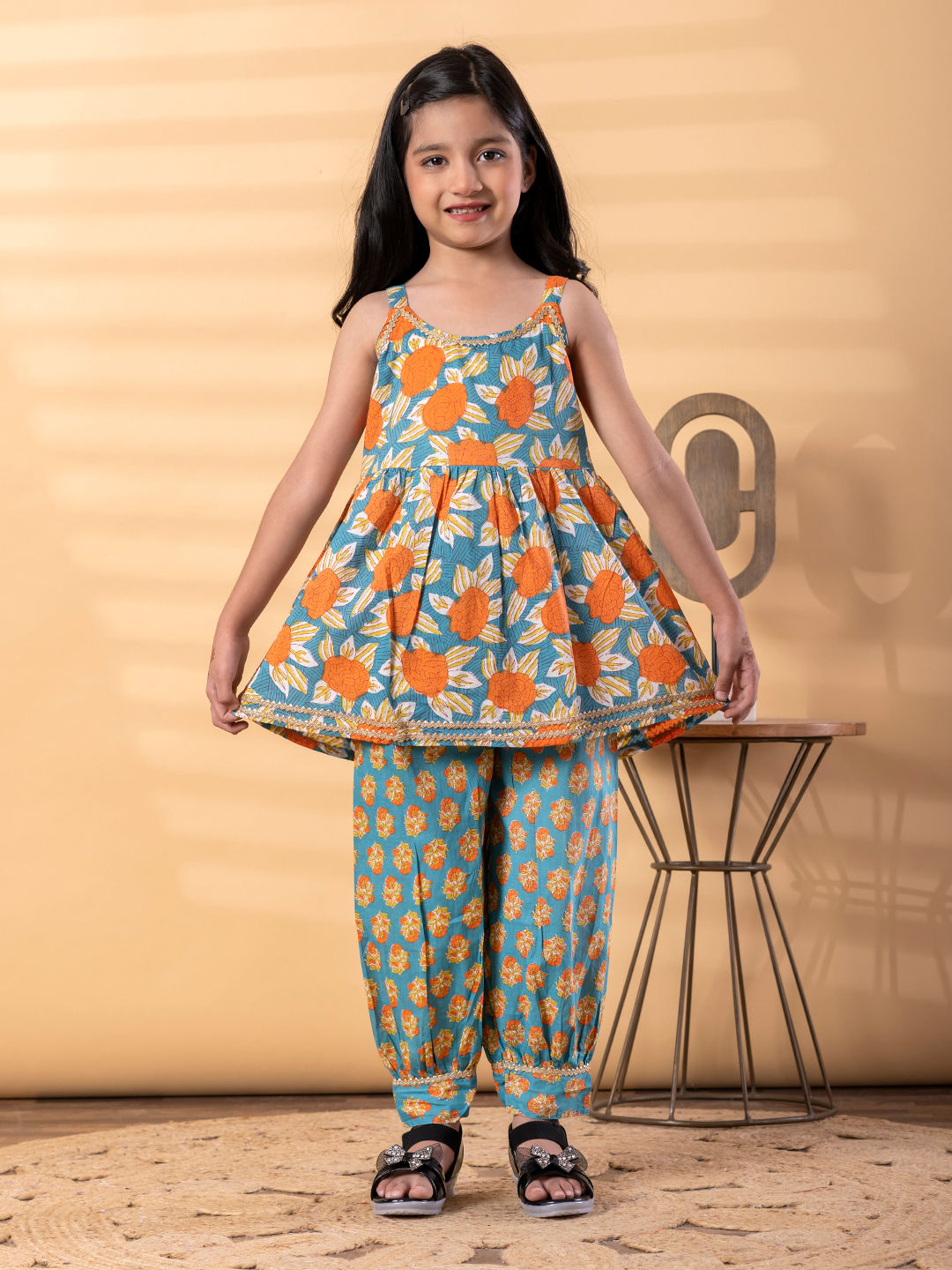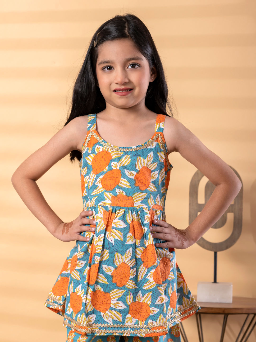 Blue color Girls Top with Bottom in Cotton fabric with Floral, Gota Patti, Printed work