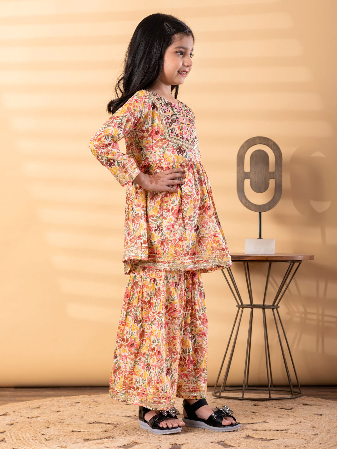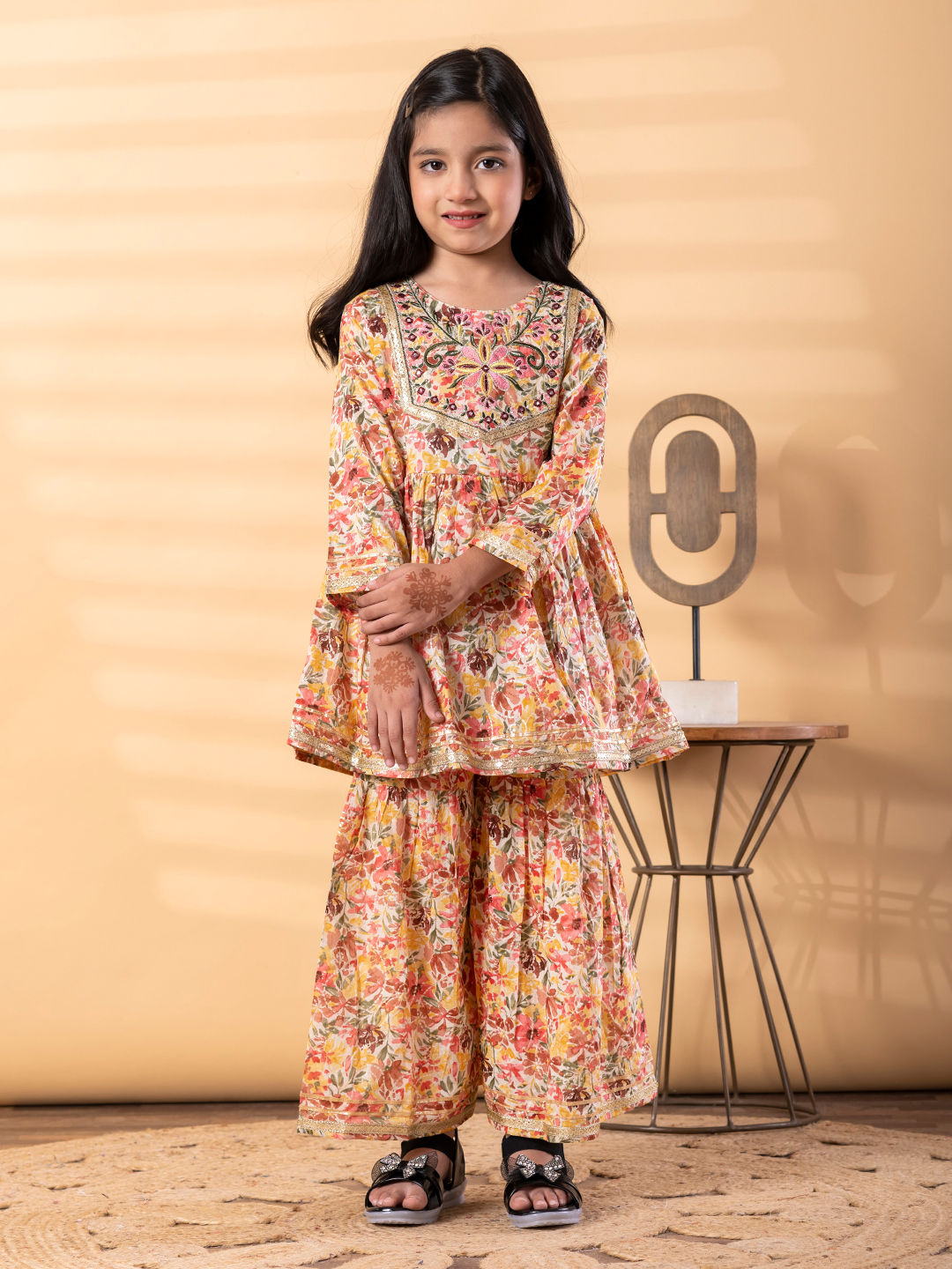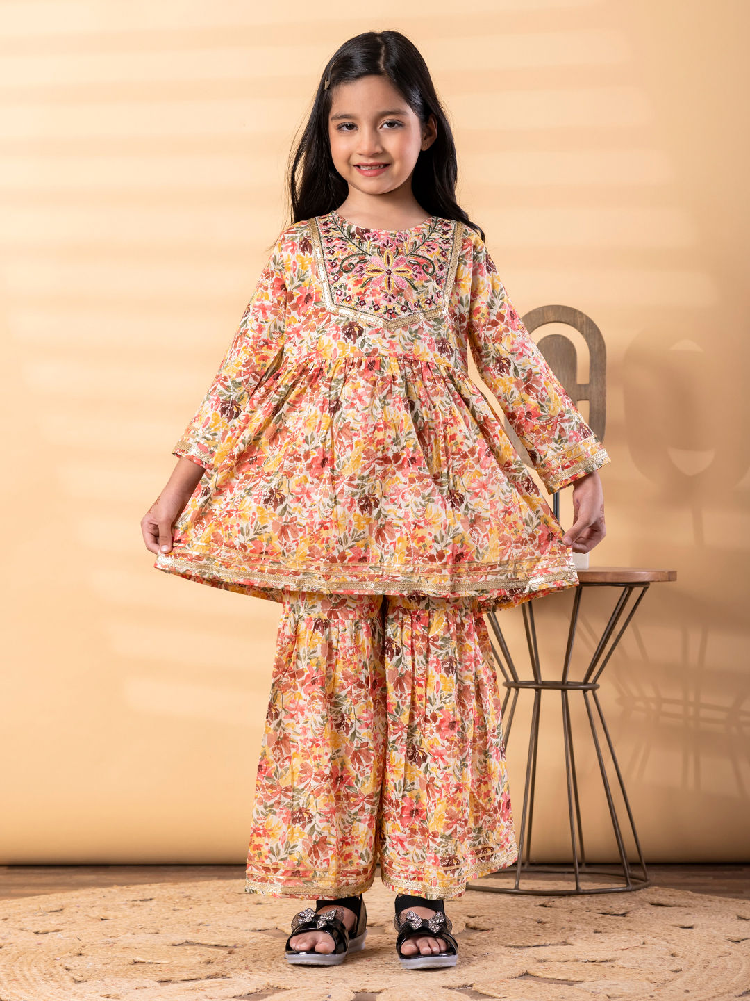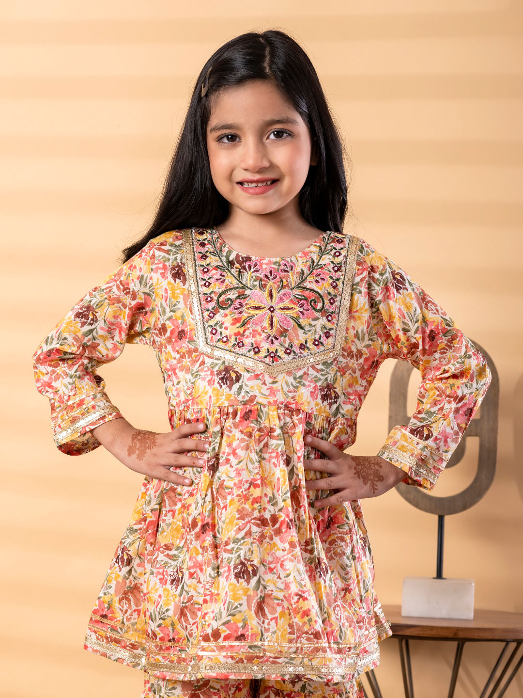 Description:  Pink and Majenta, Red and Maroon color Girls Top with Bottom in Cotton fabric with Embroidered, Floral, Mirror, Printed, Resham, Thread work
