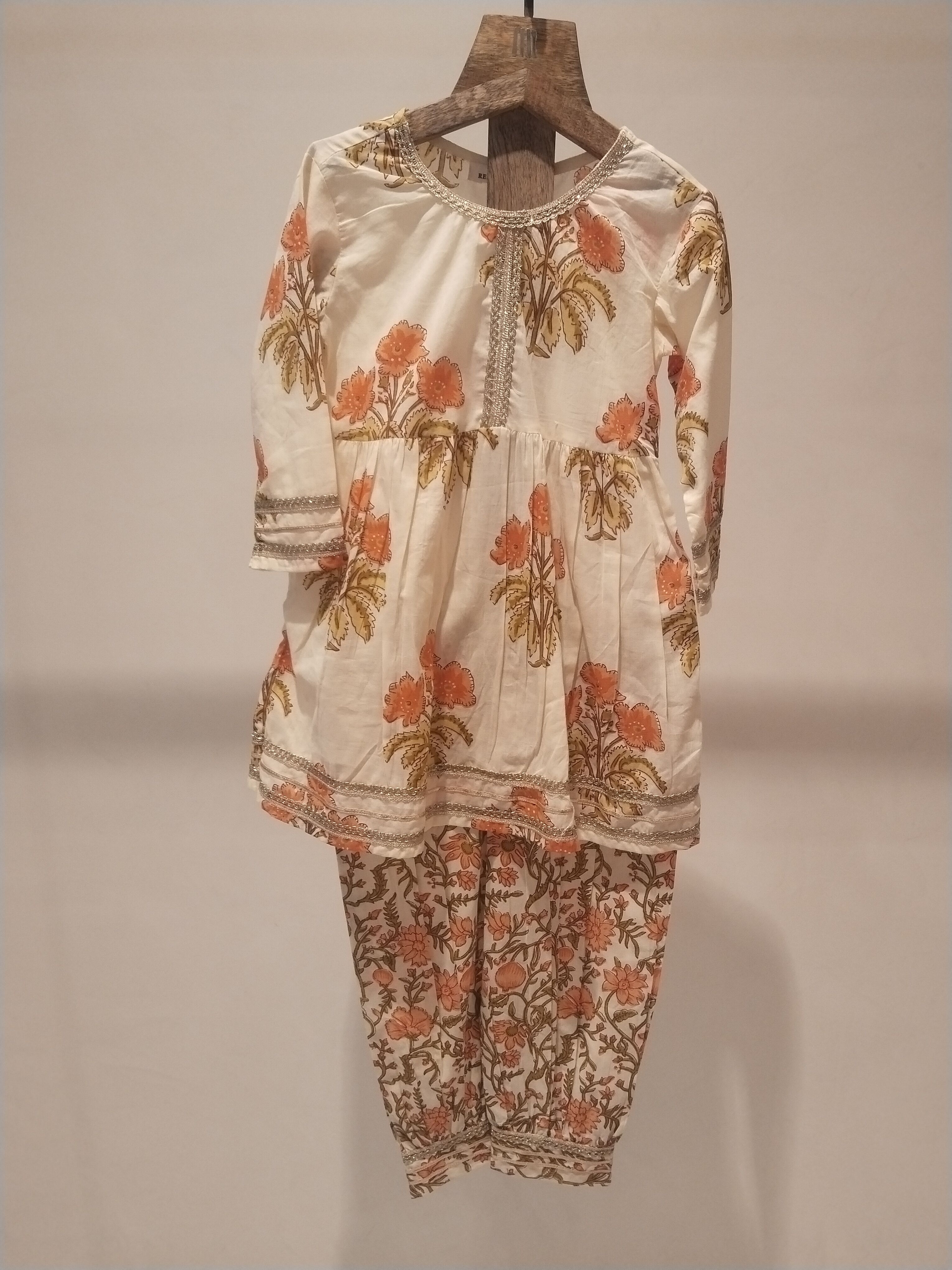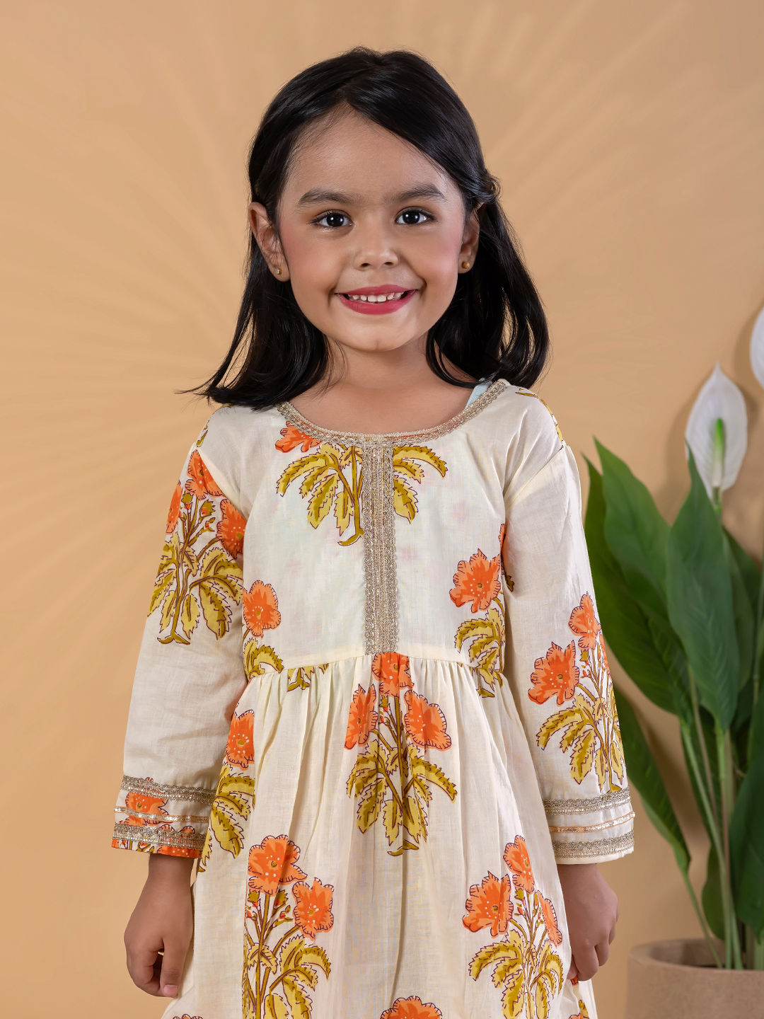 White and Off White color Girls Top with Bottom in Cotton fabric with Floral, Printed work