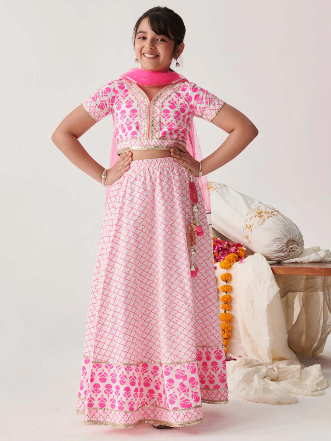 Pink and Majenta color Kids Lehenga in Cotton fabric with Floral, Lace, Printed work