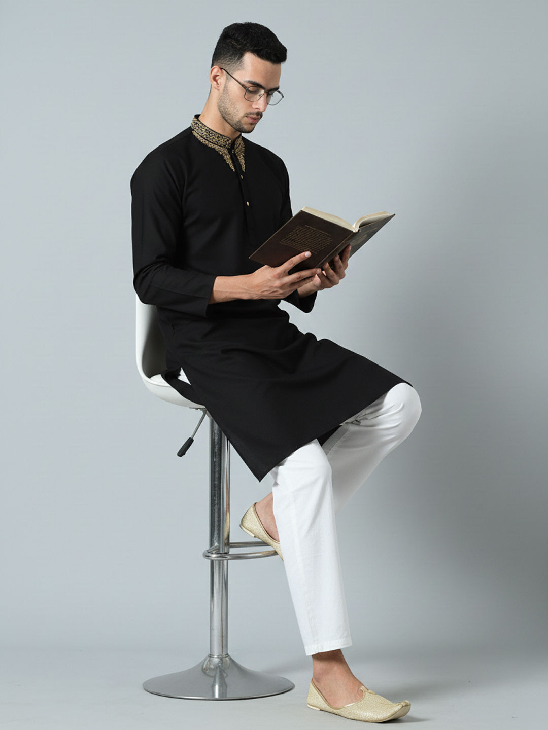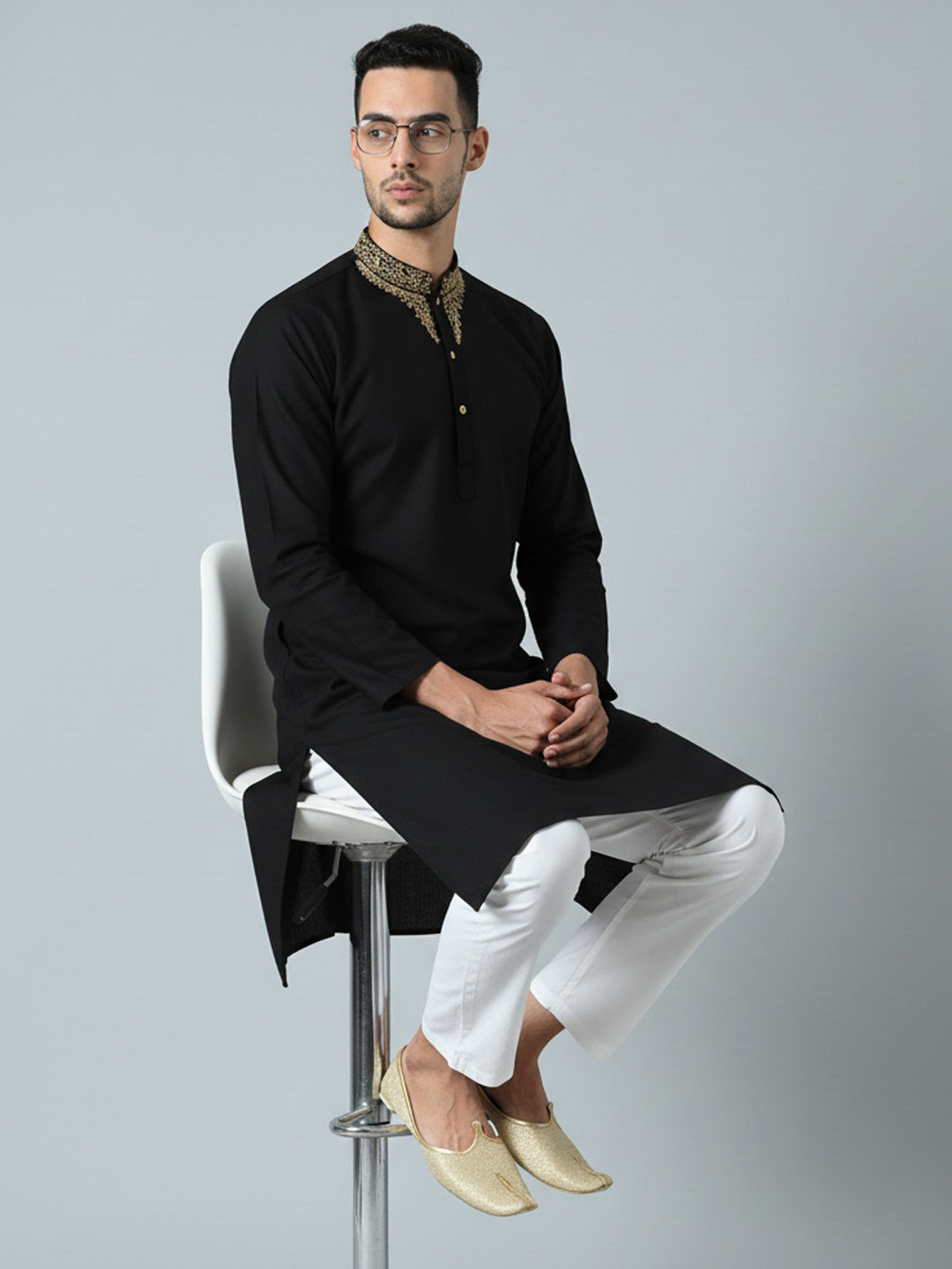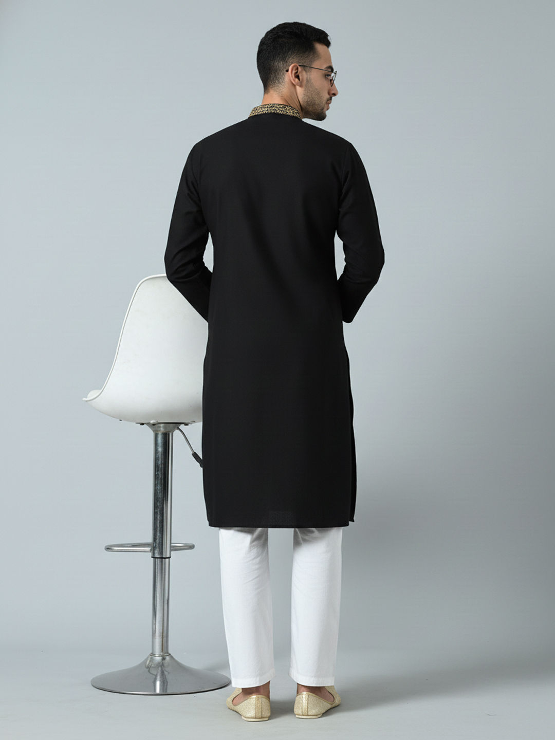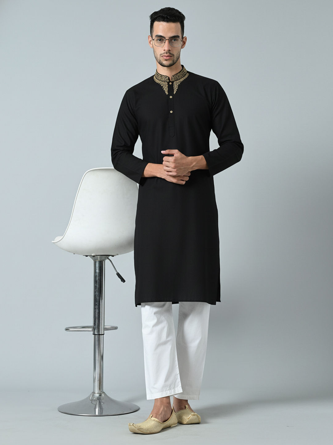 Black and Grey color Kurta Pyjamas in Cotton fabric with Embroidered work