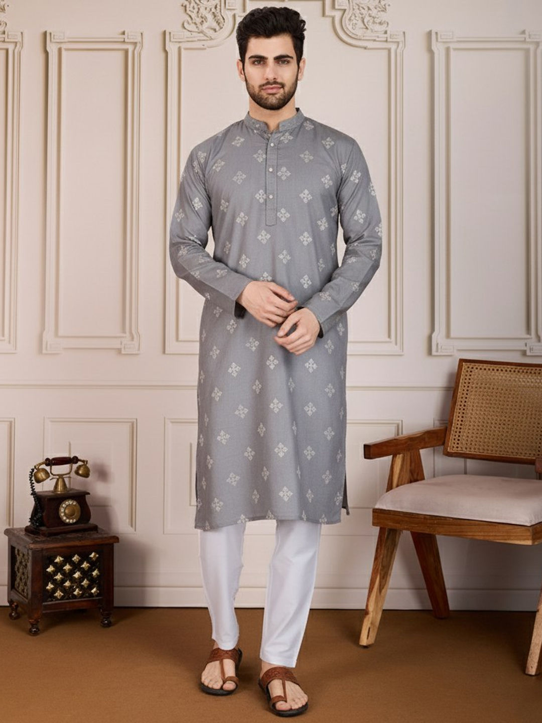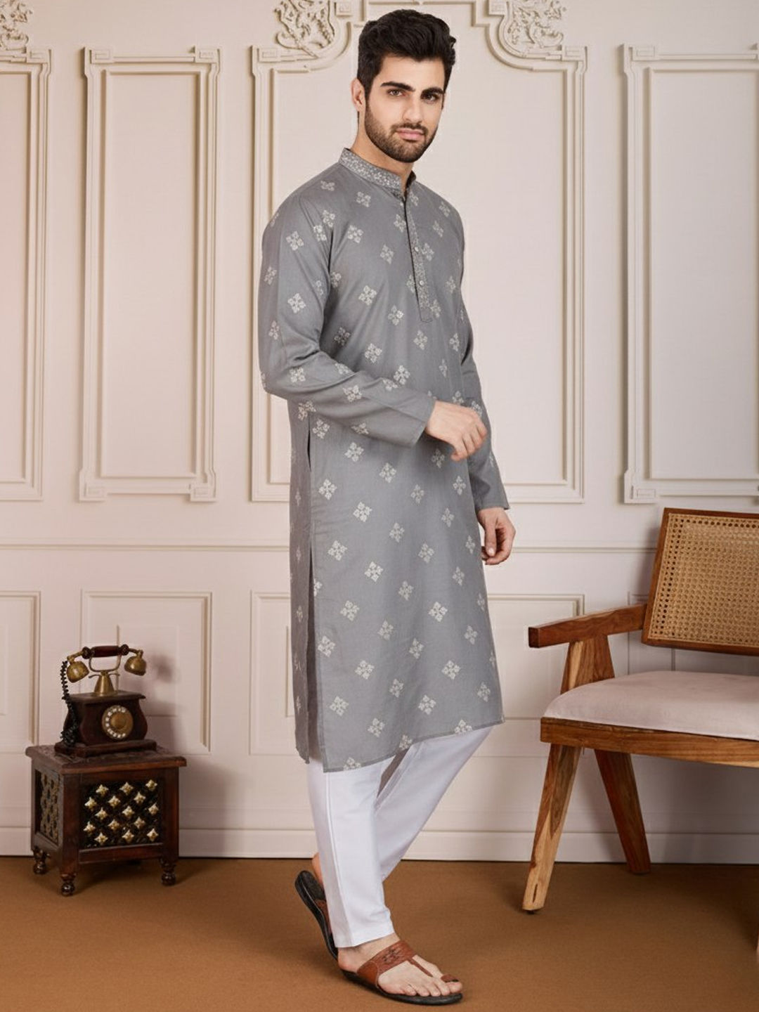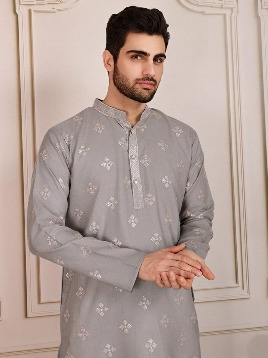 Black and Grey color Kurta Pyjamas in Cotton fabric with Embroidered, Thread work