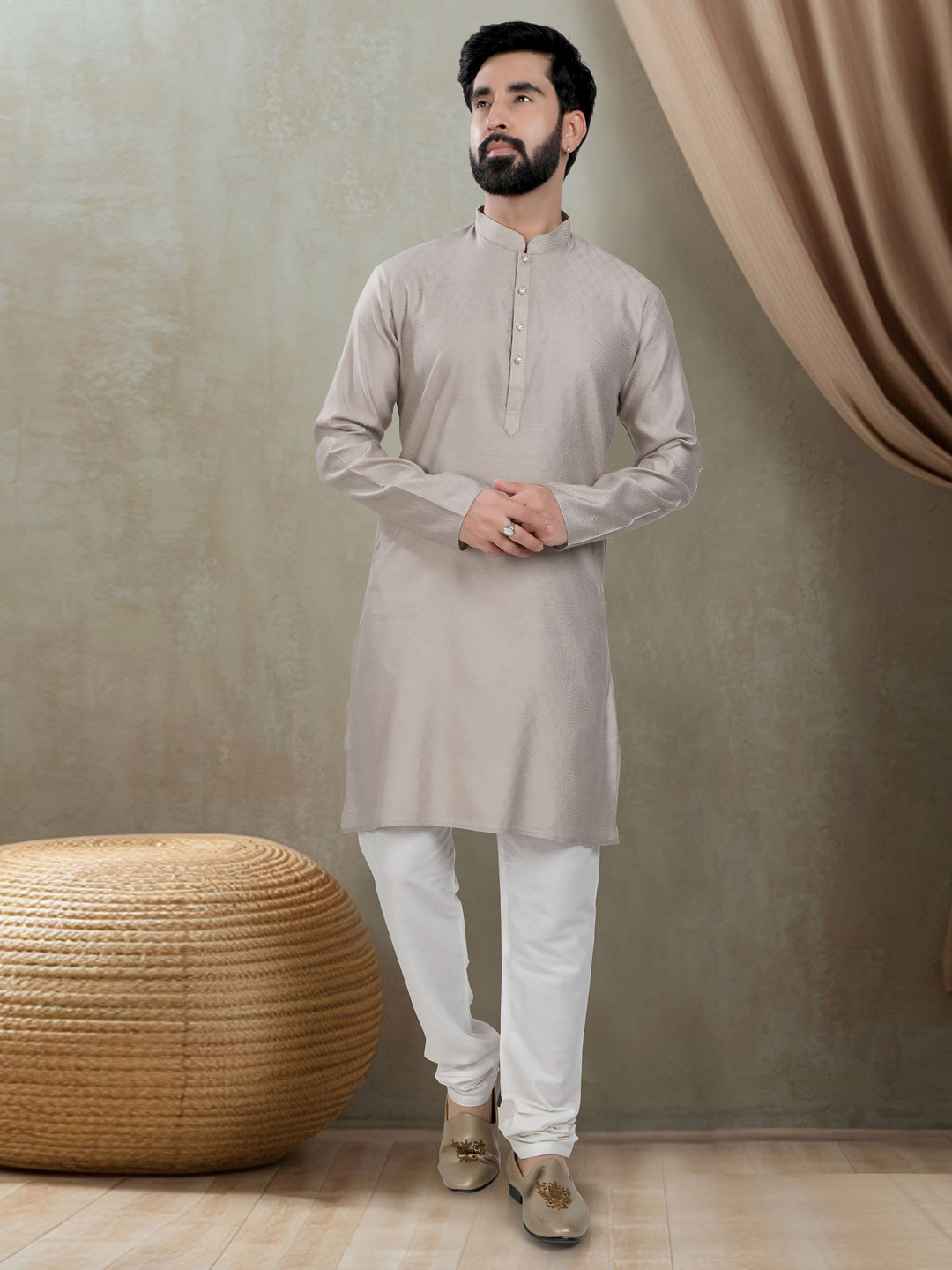 Silk cotton Wedding Kurta Pyjamas in Black and Grey with Printed work