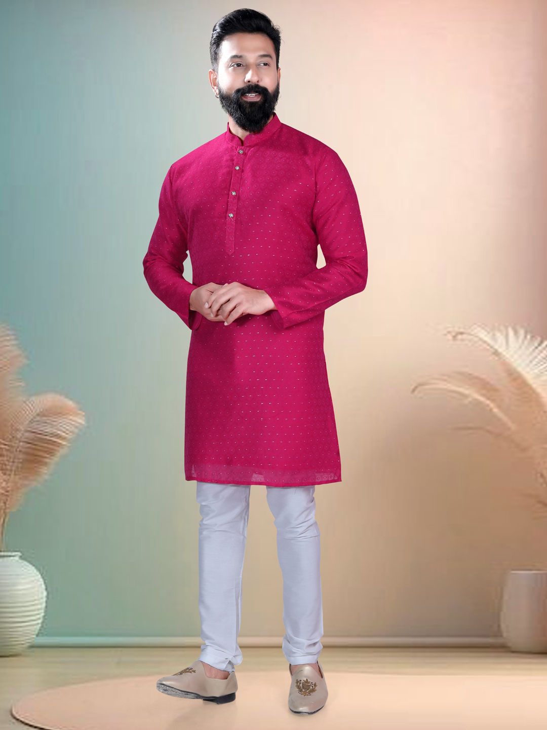 Pink and Majenta color Kurta Pyjamas in Cotton fabric with Bugle Beads work