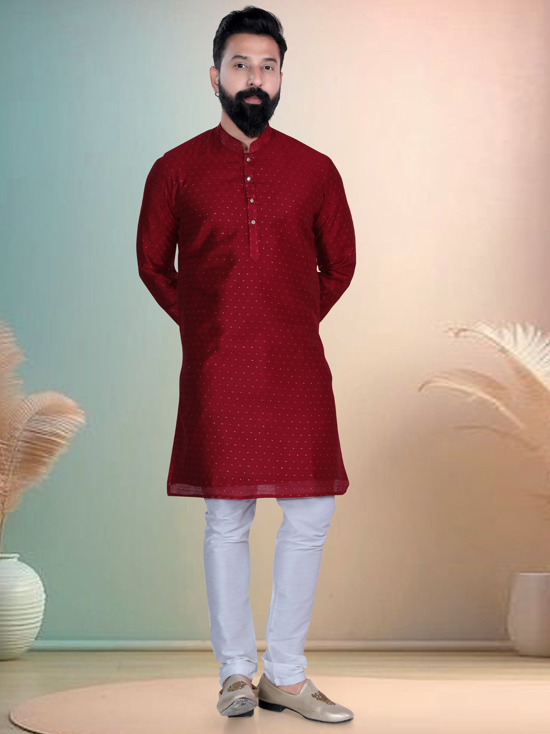 Red and Maroon color Kurta Pyjamas in Cotton fabric with Bugle Beads work