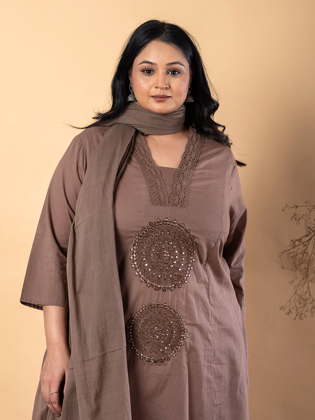 Beige and Brown color Salwar Kameez in Cotton fabric with Embroidered, Resham, Thread work