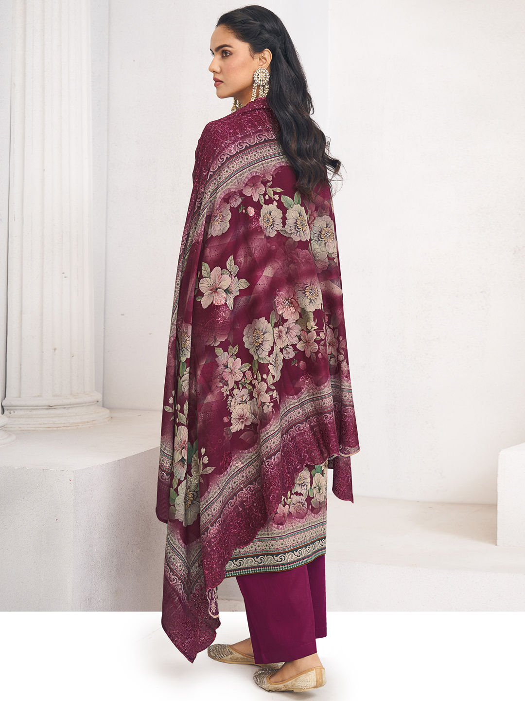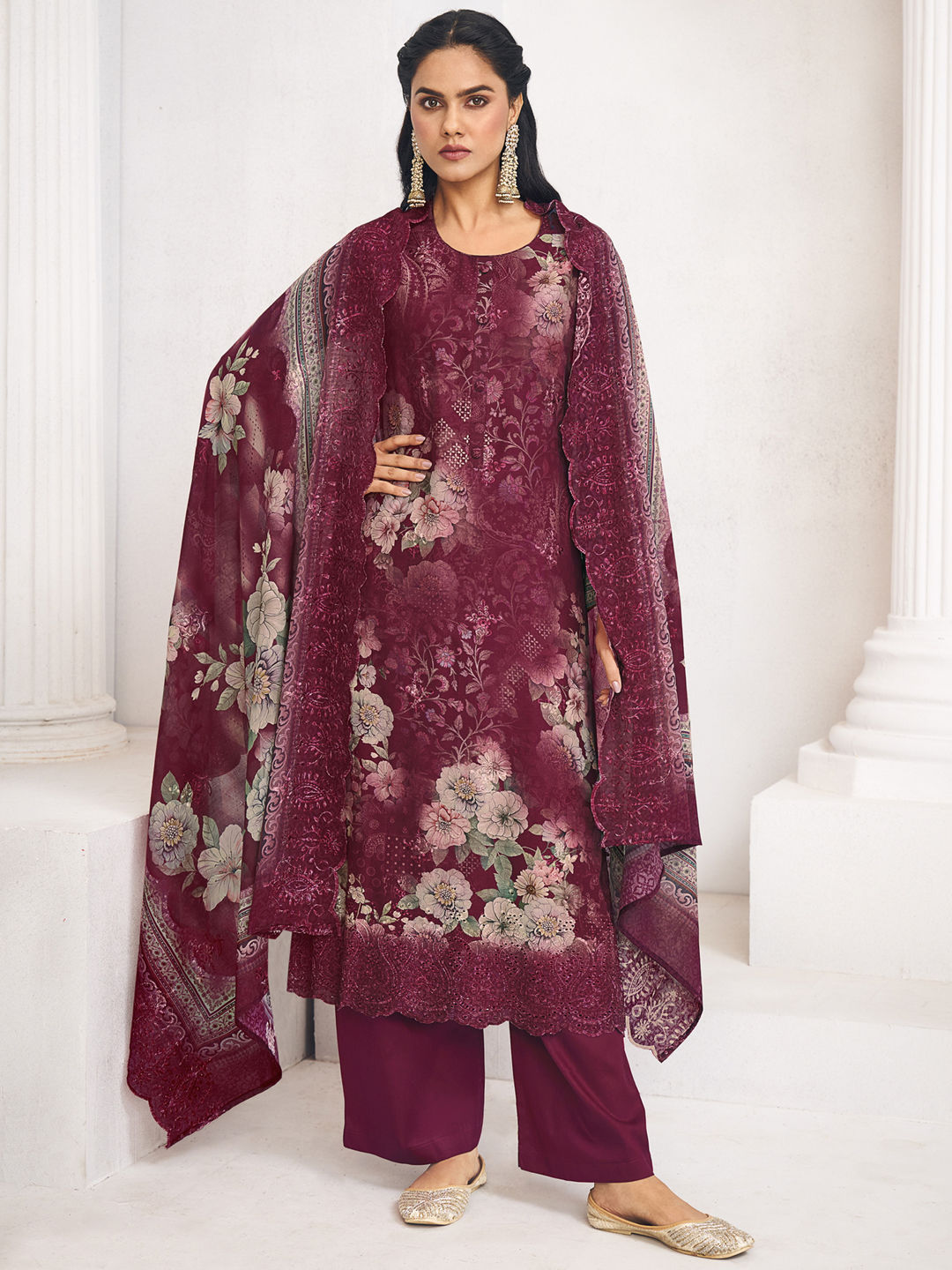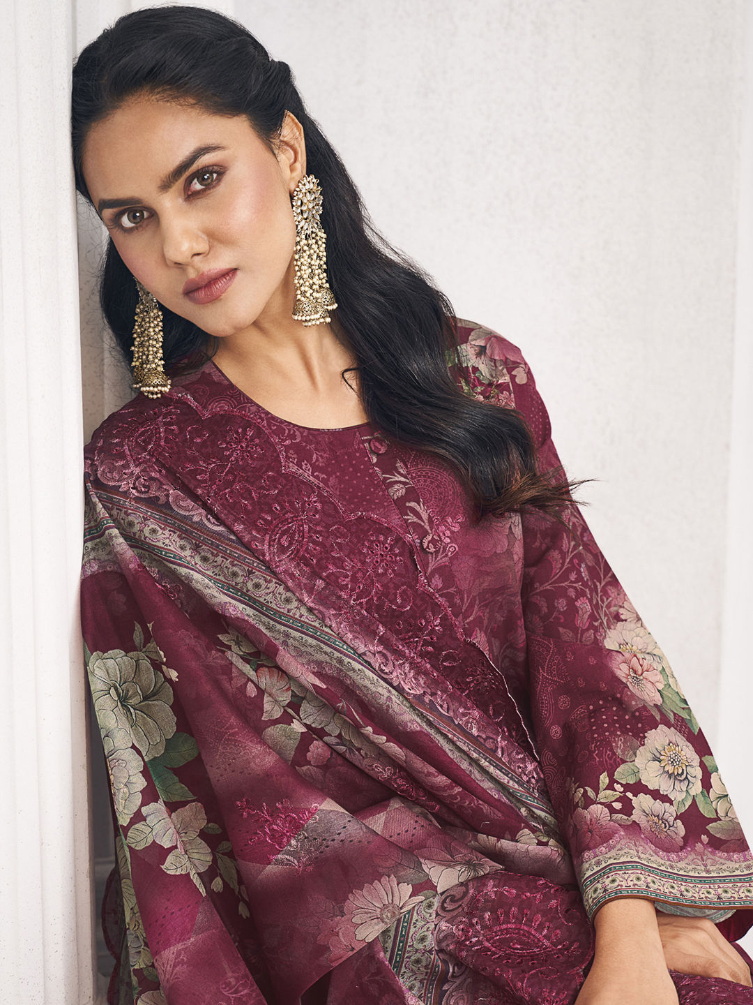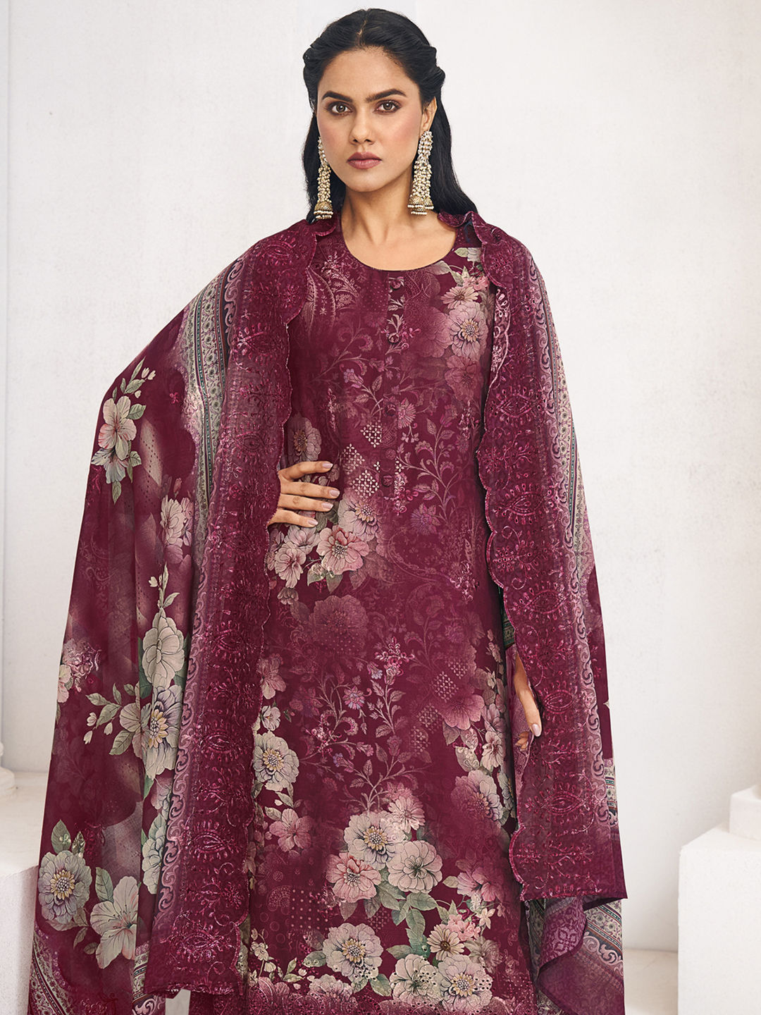 Red and Maroon color Salwar Kameez in Cotton, Lawn fabric with Digital Print, Floral, Resham, Thread work