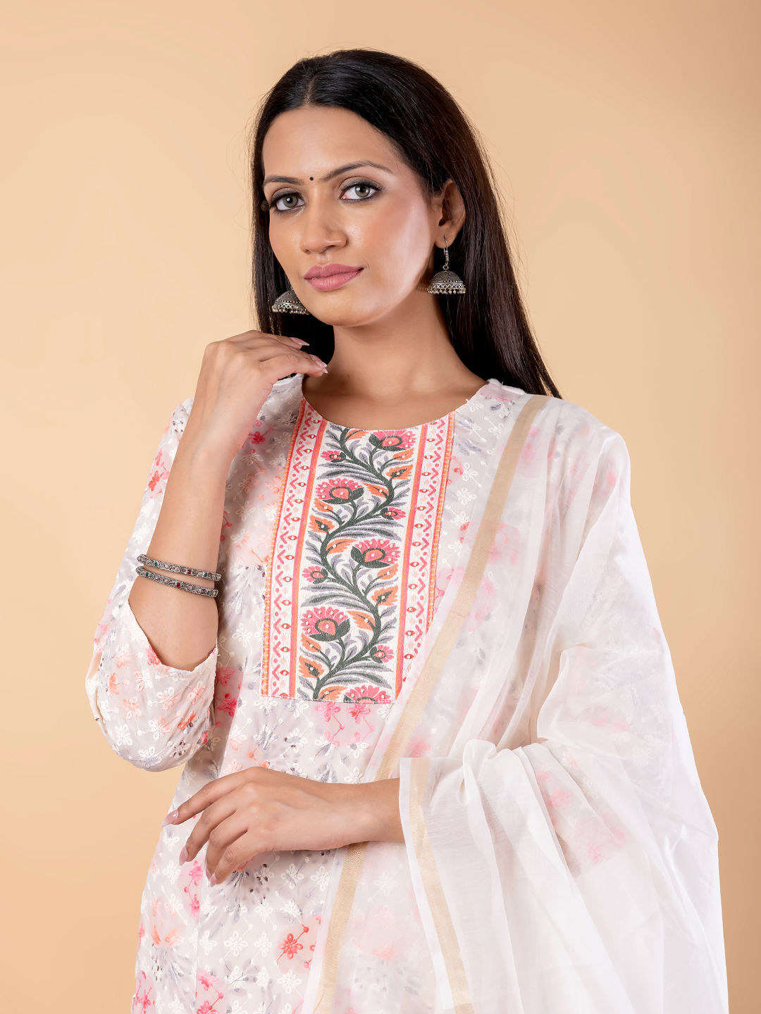 White and Off White color Salwar Kameez in Cotton, Dobby fabric with Embroidered, Printed, Resham work