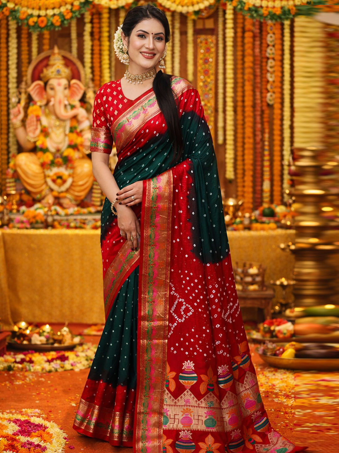 Green color Saree in Cotton fabric with Bandhej, Printed, Weaving work