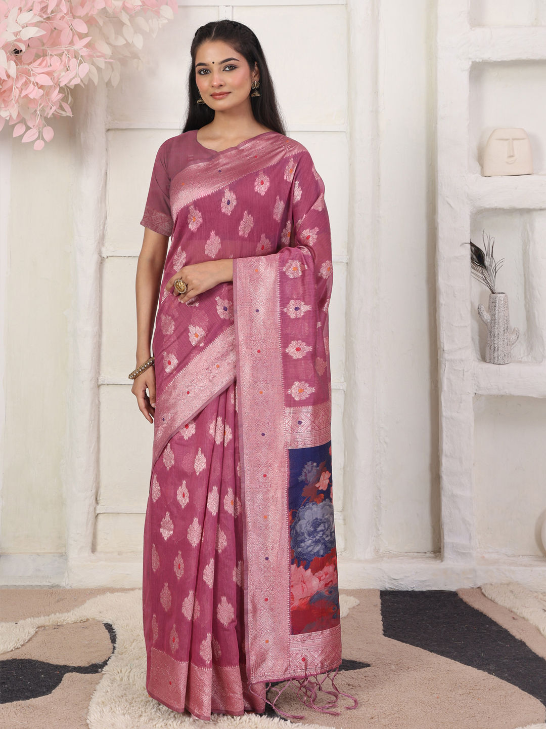 Pink and Majenta color Saree in Cotton, Linen fabric with Digital Print, Weaving work