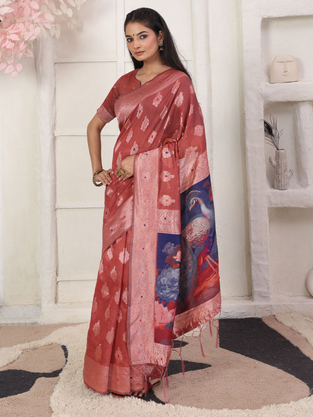 Red and Maroon color Saree in Cotton, Linen fabric with Digital Print, Weaving work