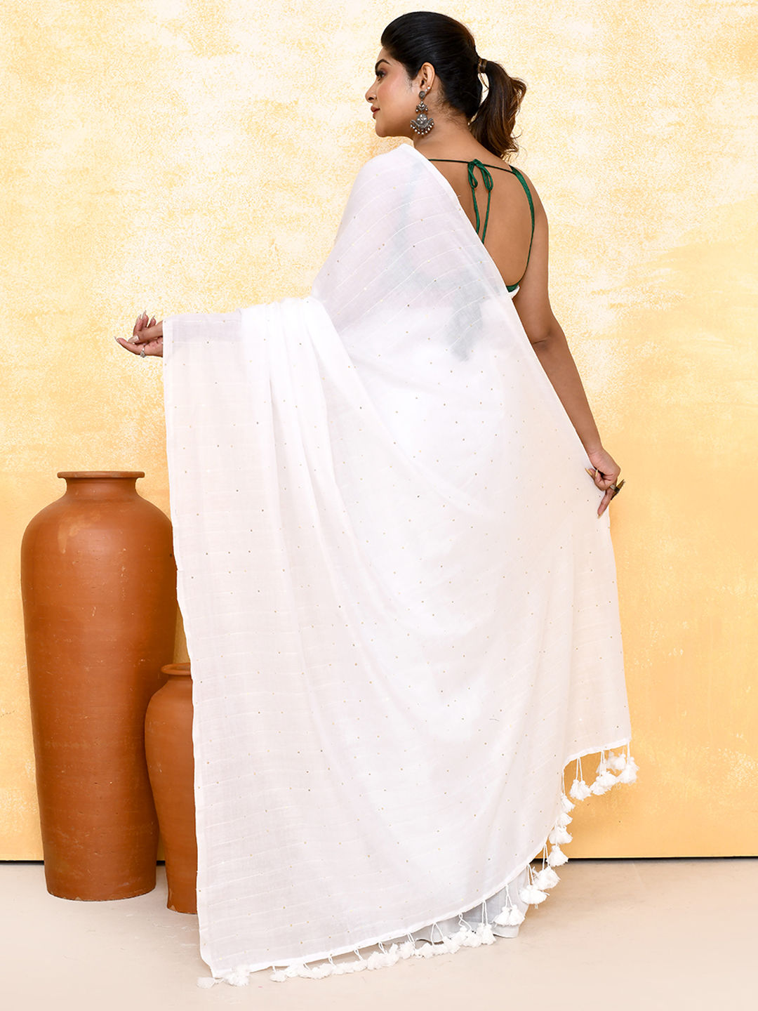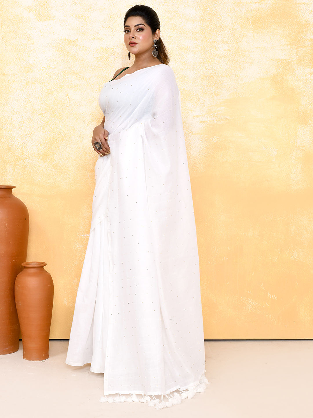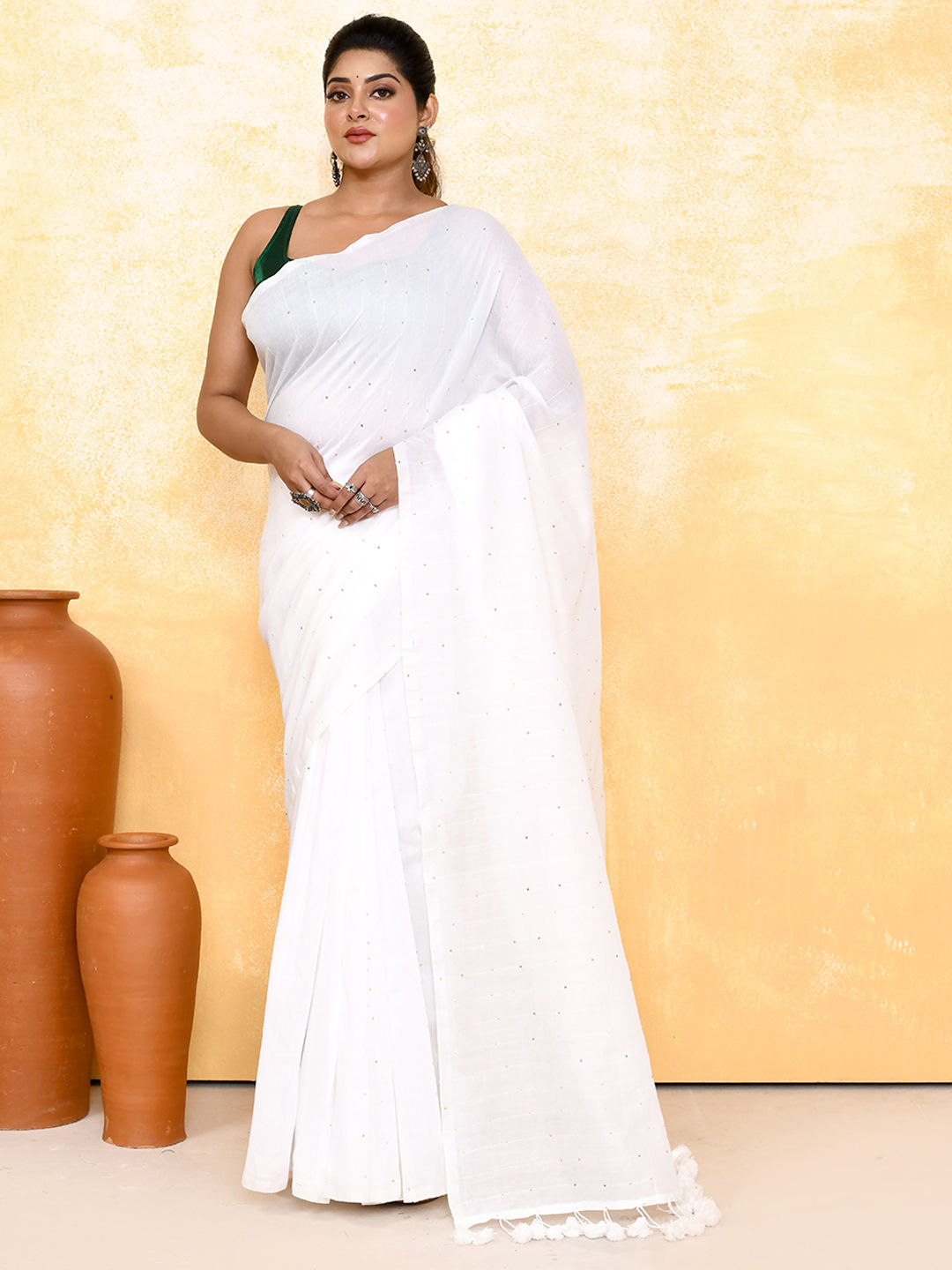 White and Off White color Saree in Cotton, Malmal fabric with Weaving work