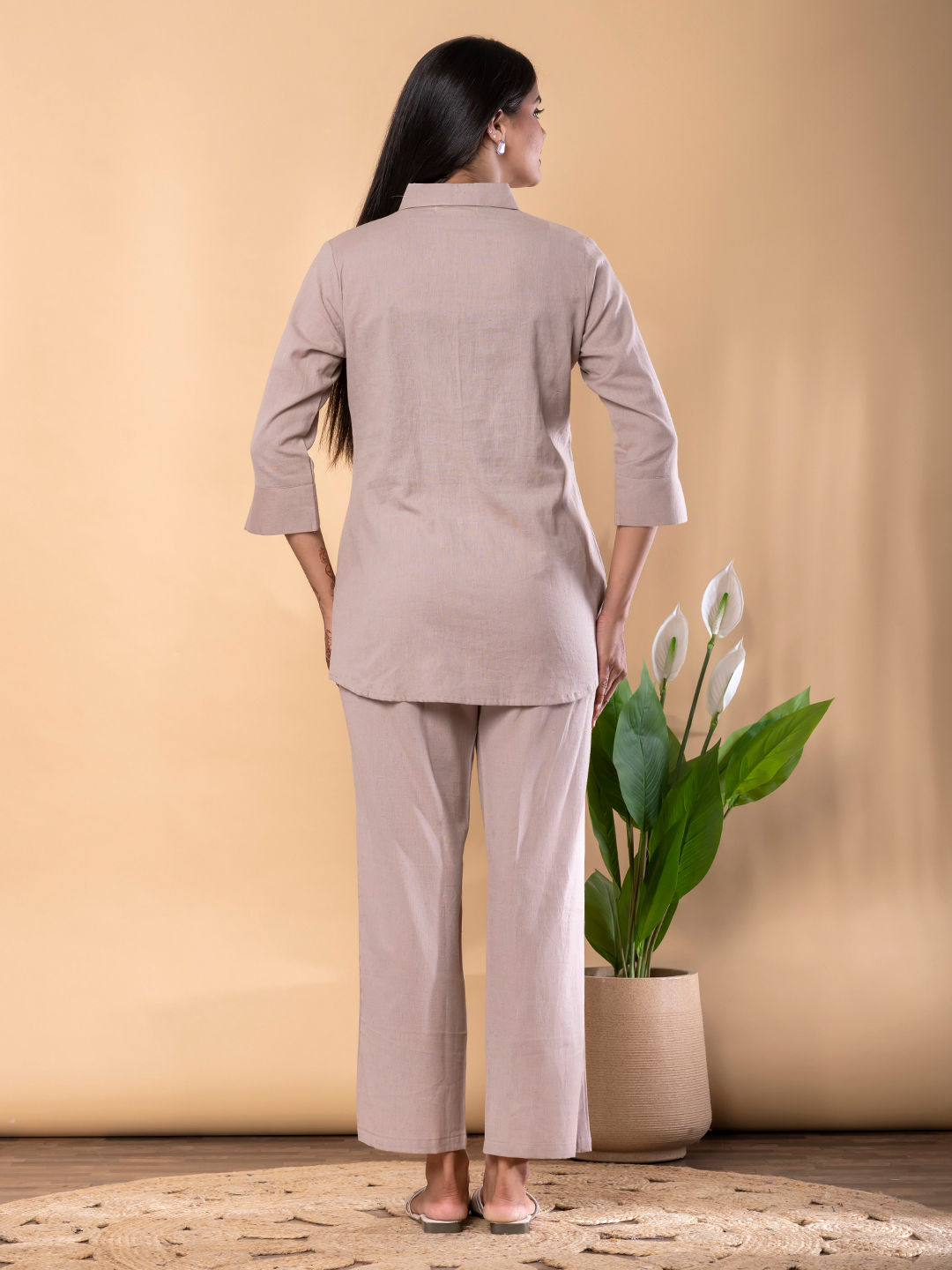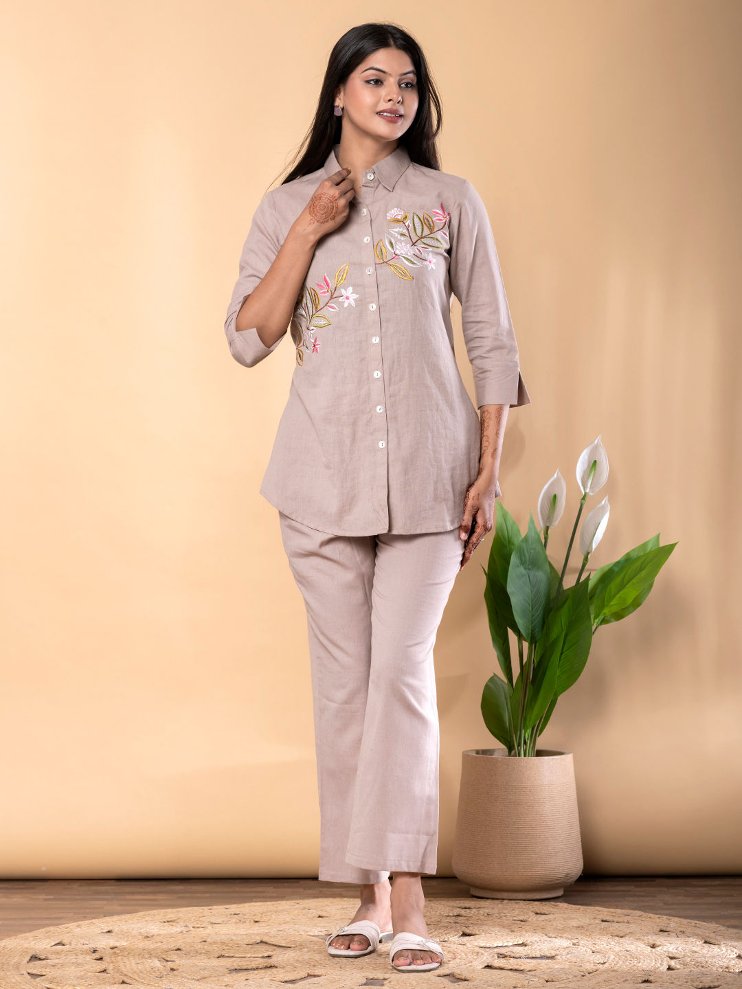 Linen Casual Co-ords Set in Beige and Brown with Thread work