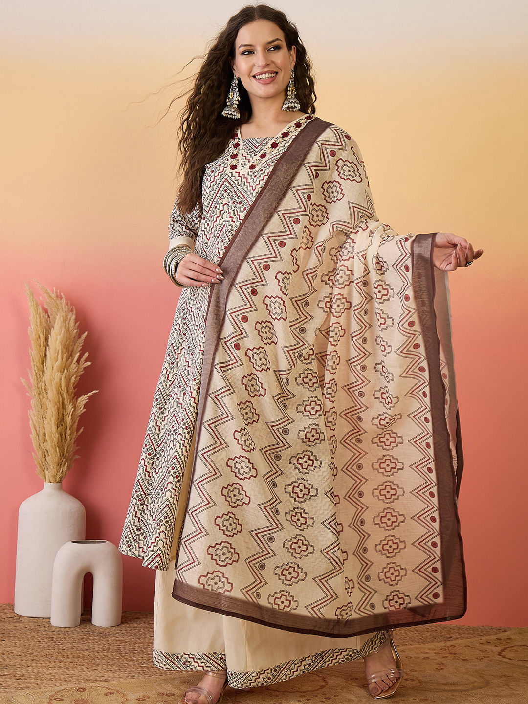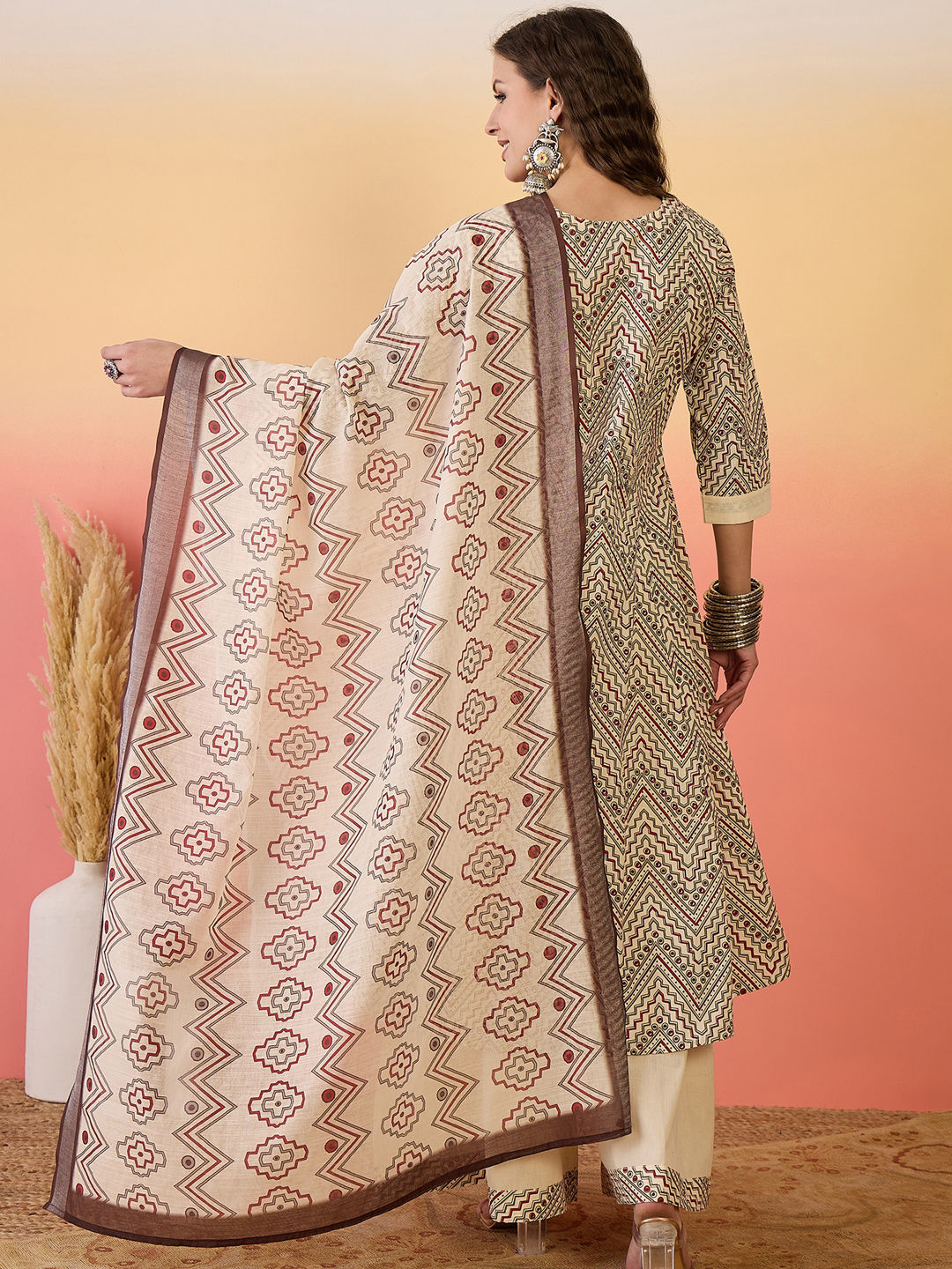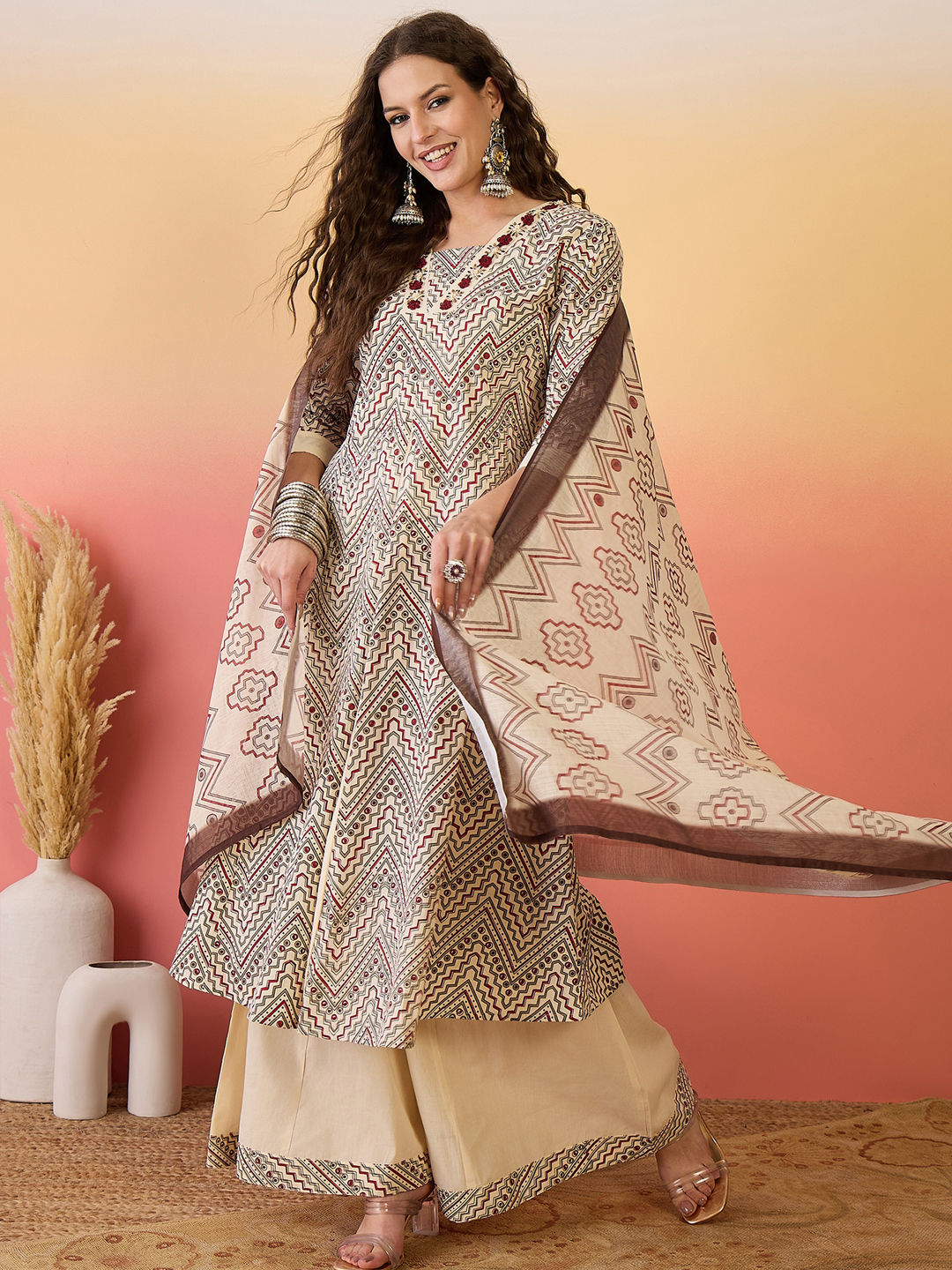 Beige and Brown color Salwar Kameez in Cotton Flex fabric with Embroidered, Printed, Thread work