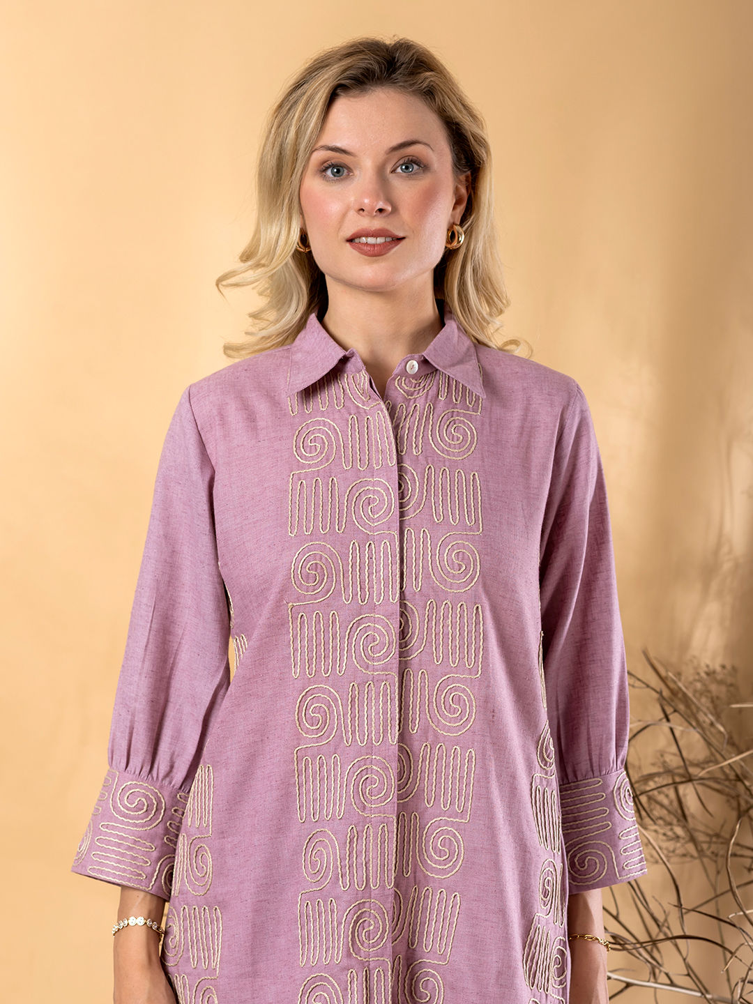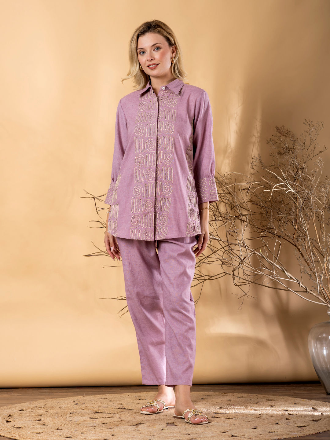 Linen Casual Co-ords Set in Beige and Brown with Thread work