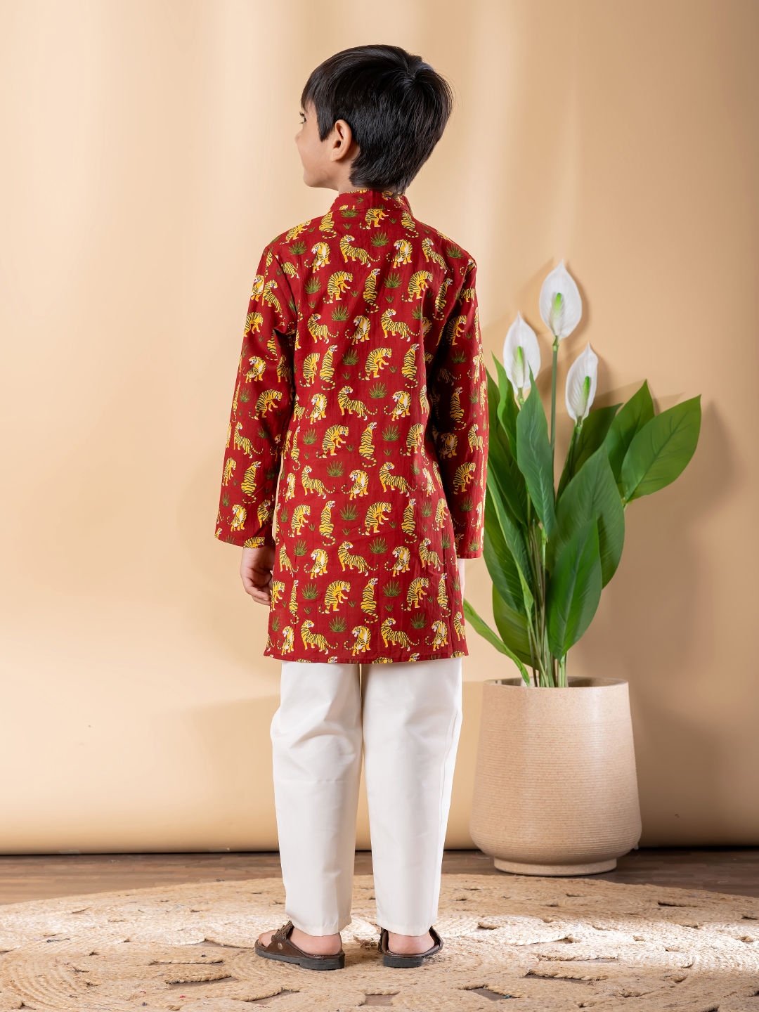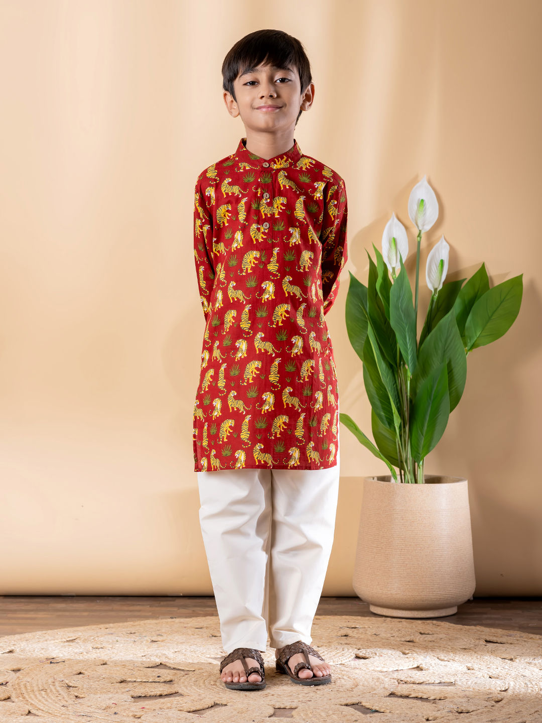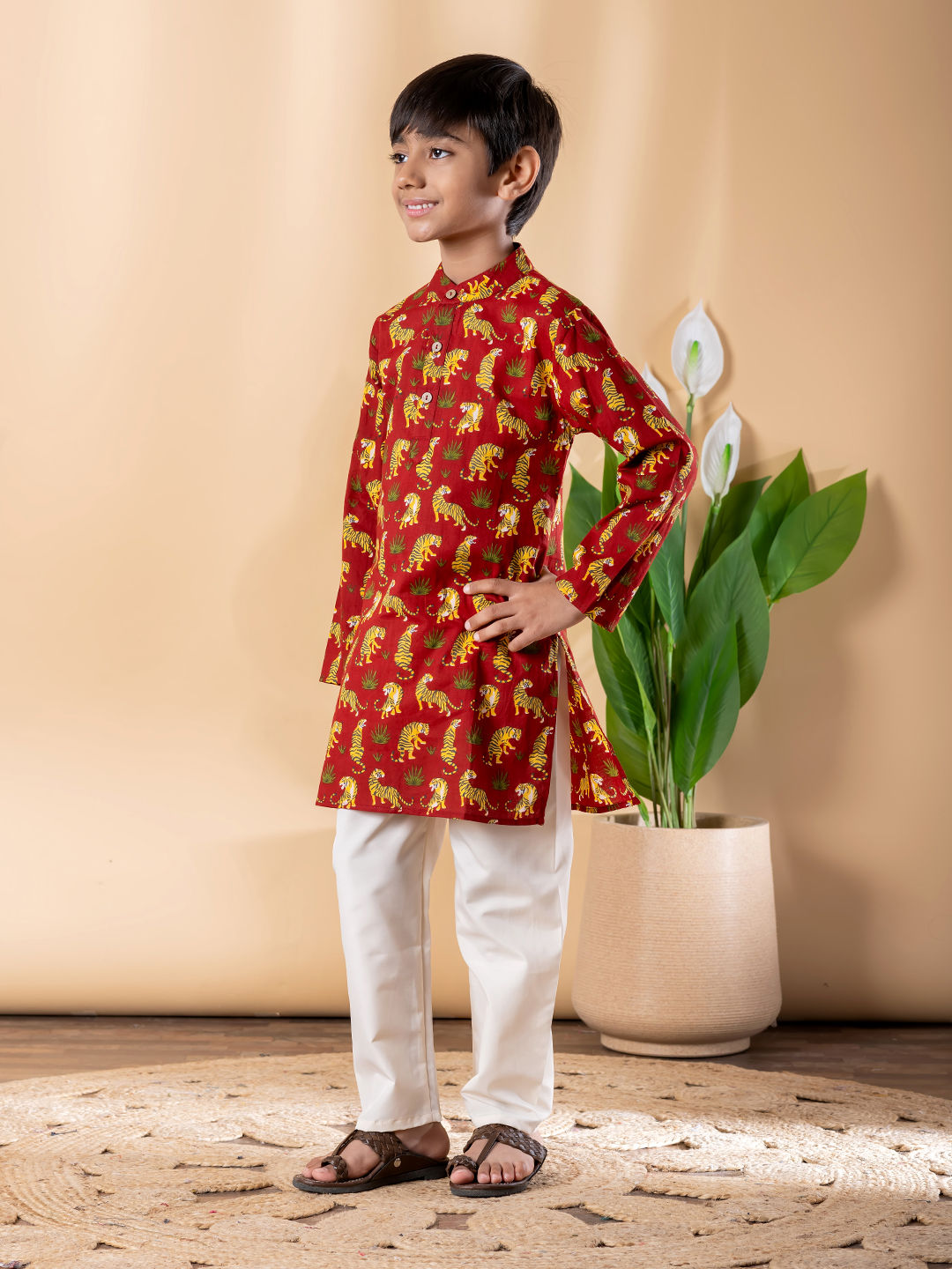 Red and Maroon color Boys Kurta Pyjama in Cotton fabric with Printed work