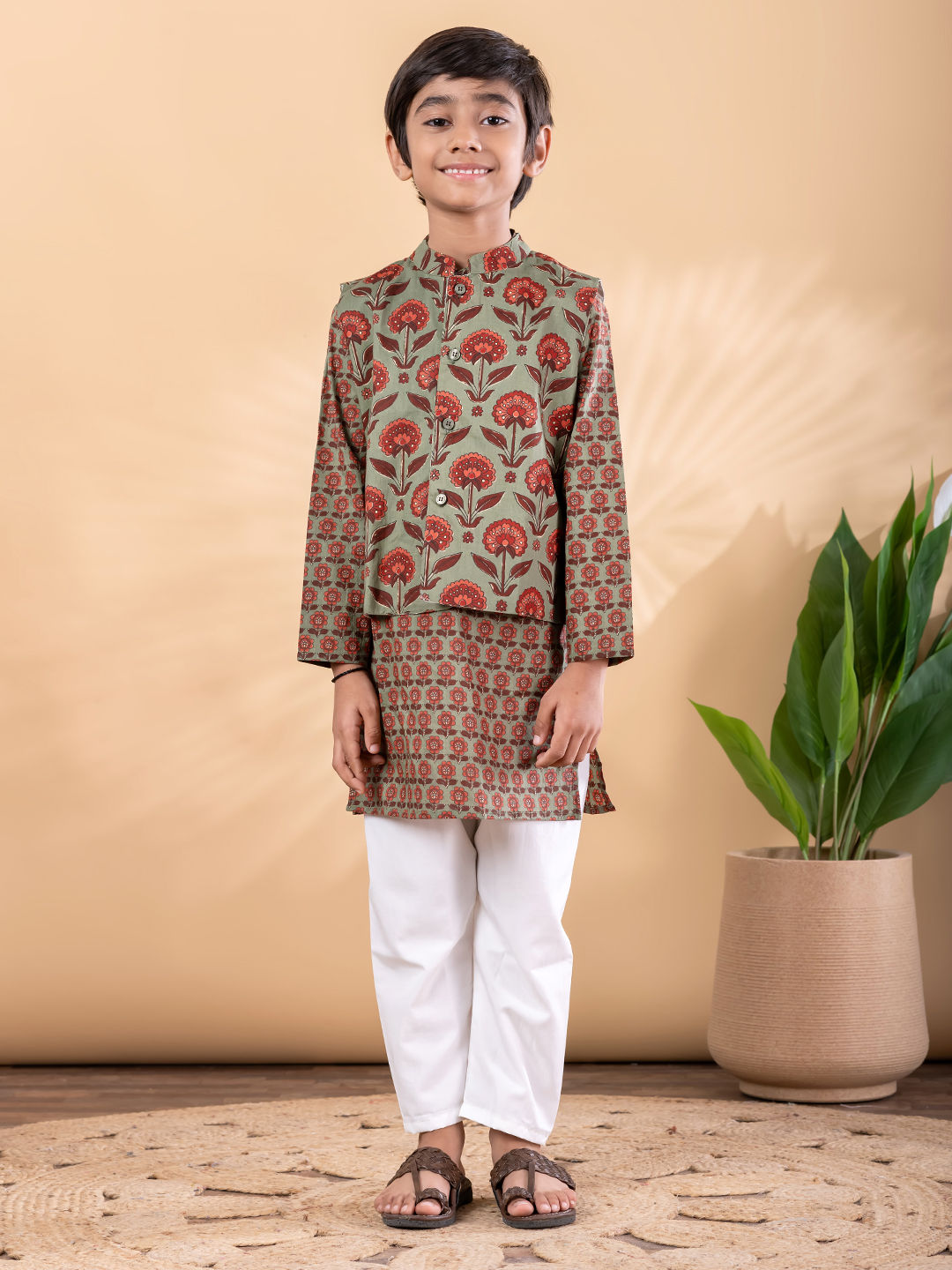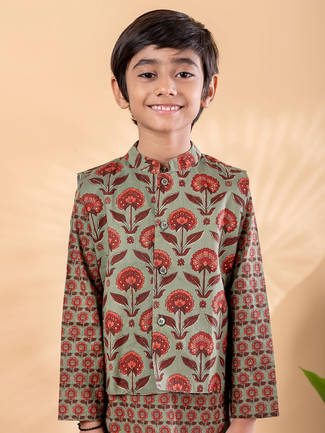 Green color Boys Kurta Pyjama with Jacket in Cotton fabric with Floral, Printed work