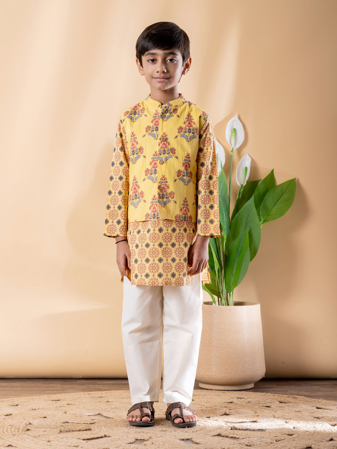 Yellow color Boys Kurta Pyjama with Jacket in Cotton fabric with Floral, Printed work