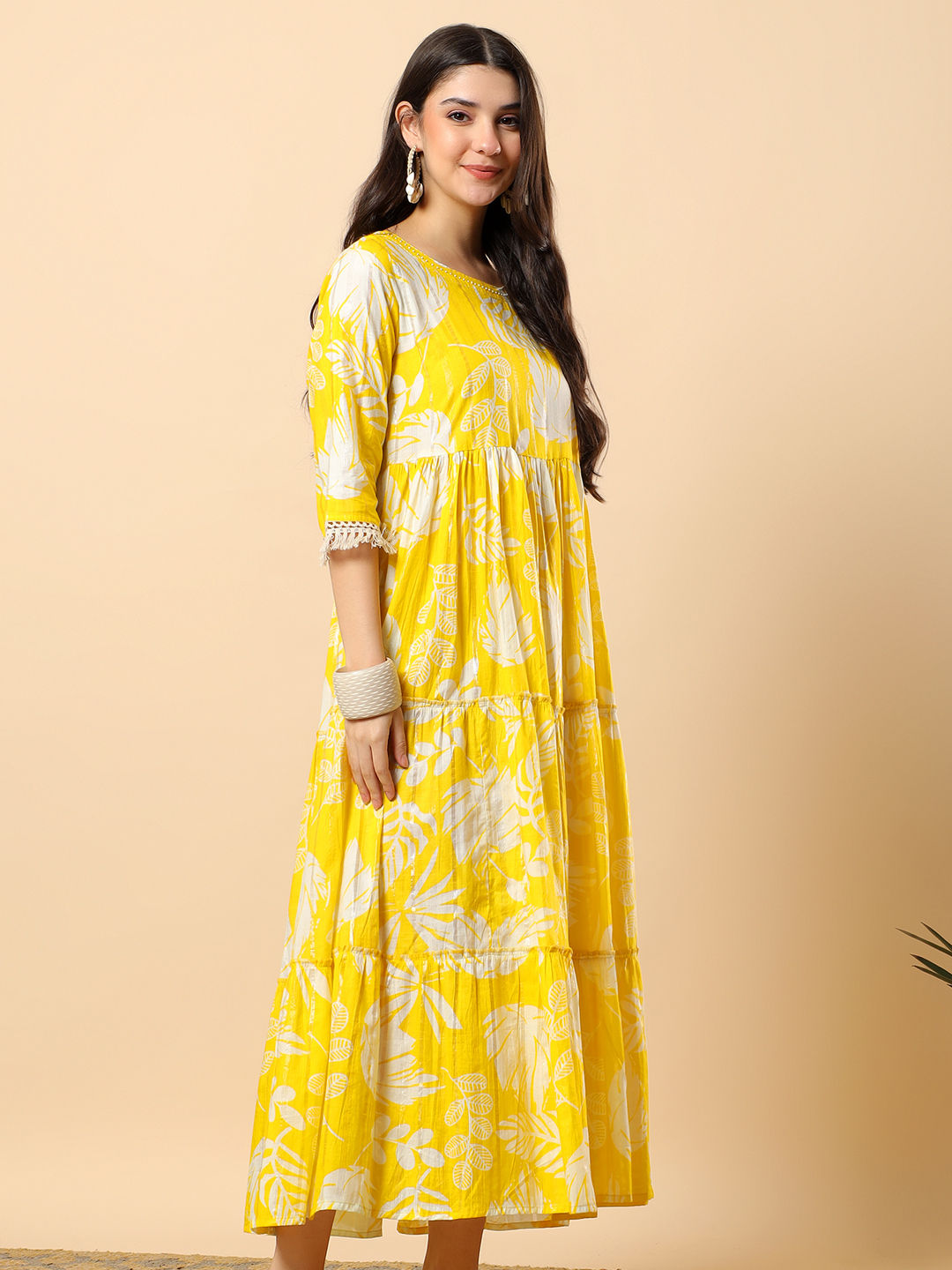 Yellow color Dress in Cotton fabric with Embroidered, Printed work
