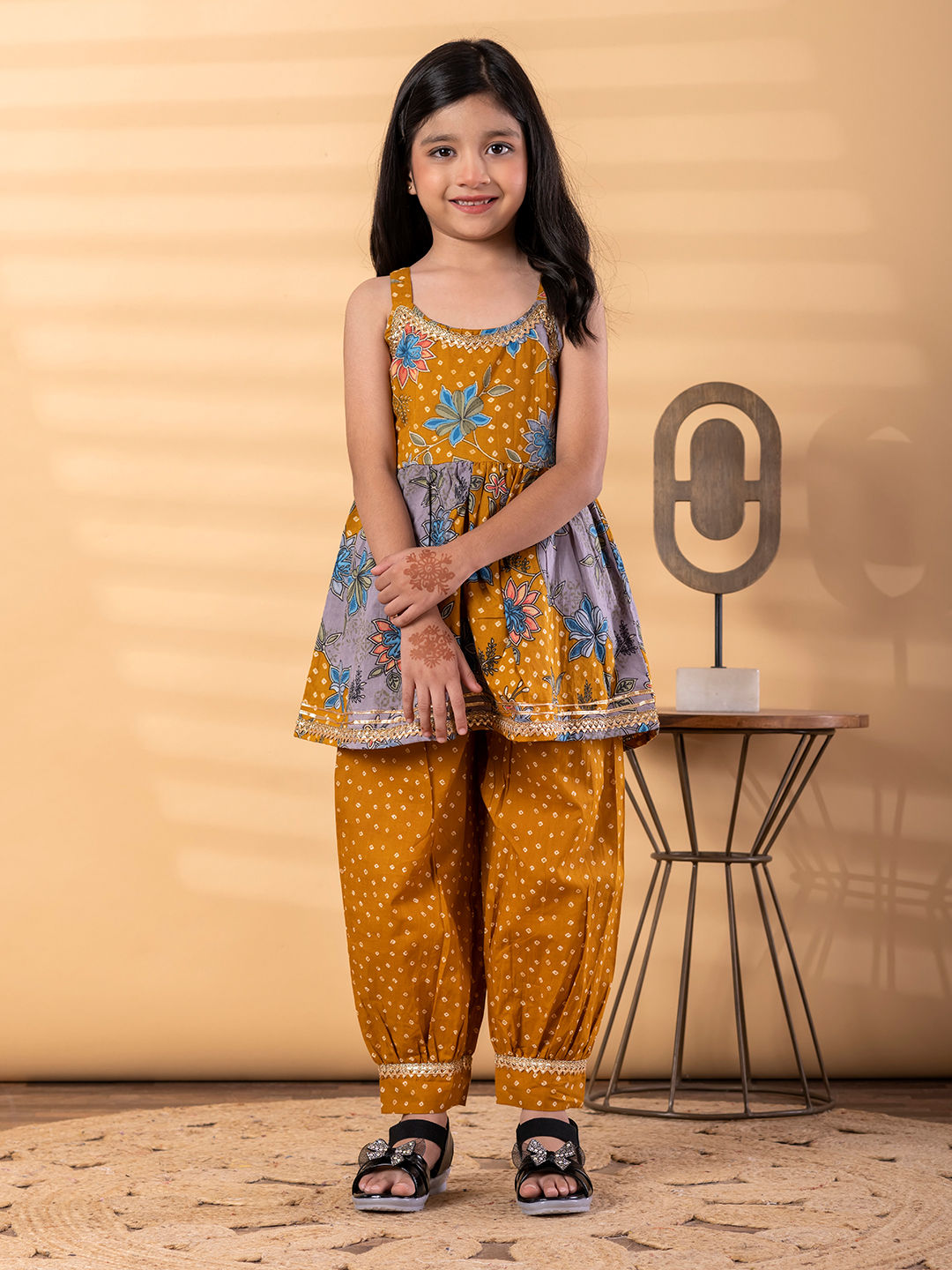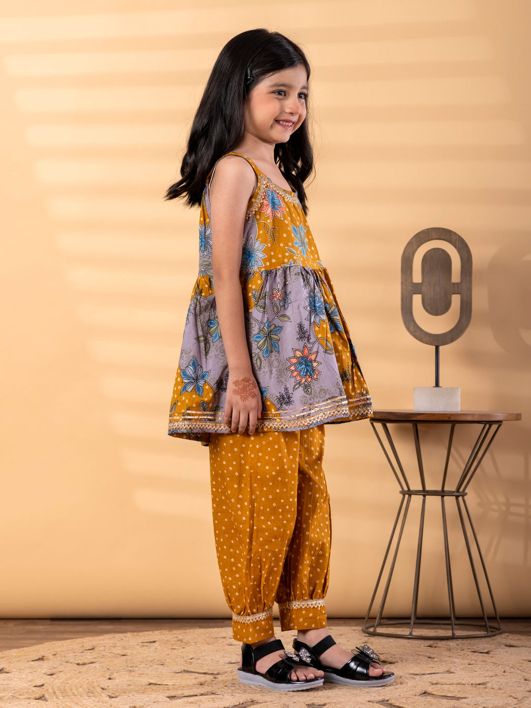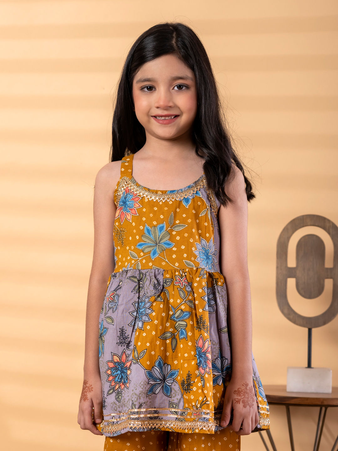 Black and Grey, Yellow color Girls Top with Bottom in Cotton fabric with Floral, Gota Patti, Printed work