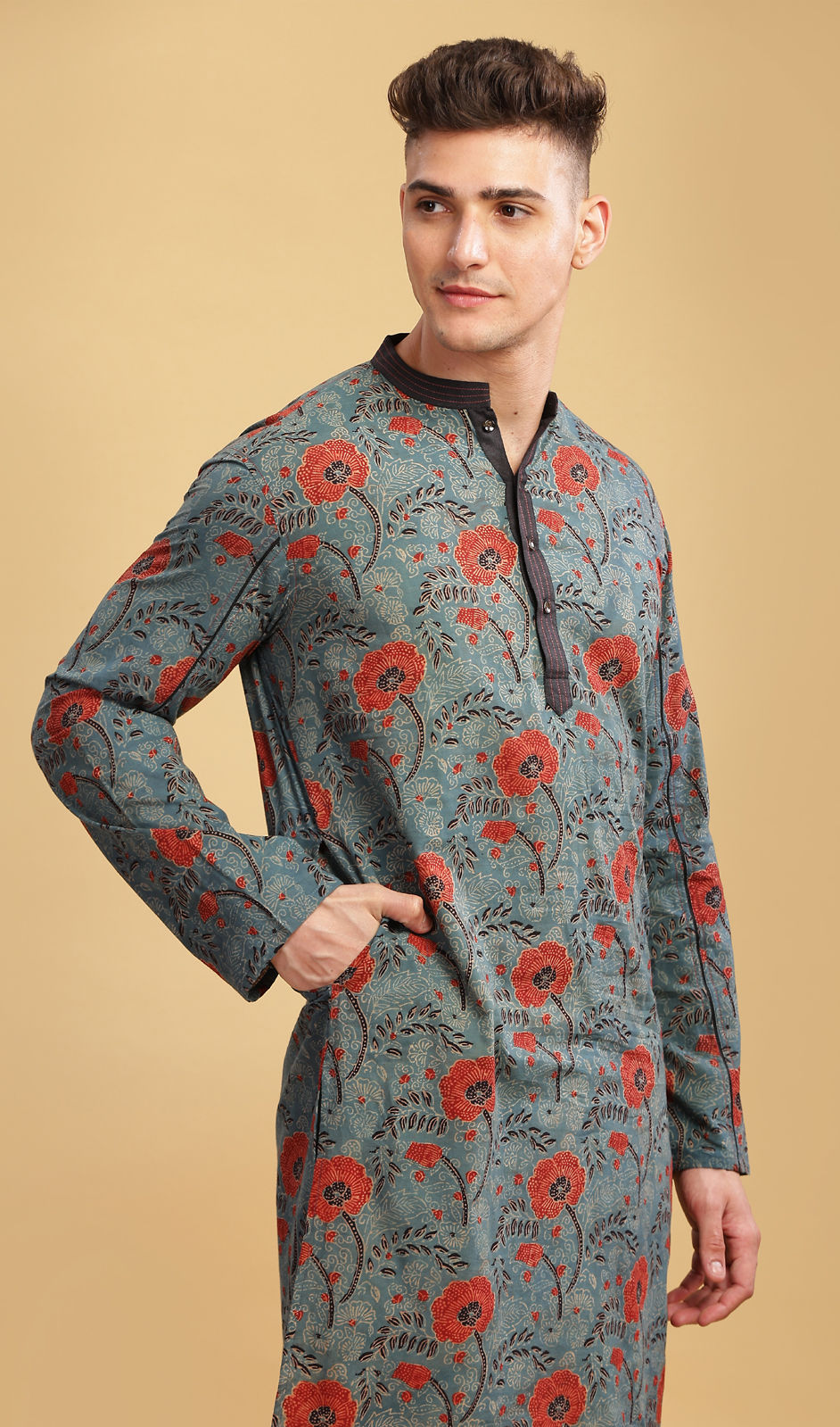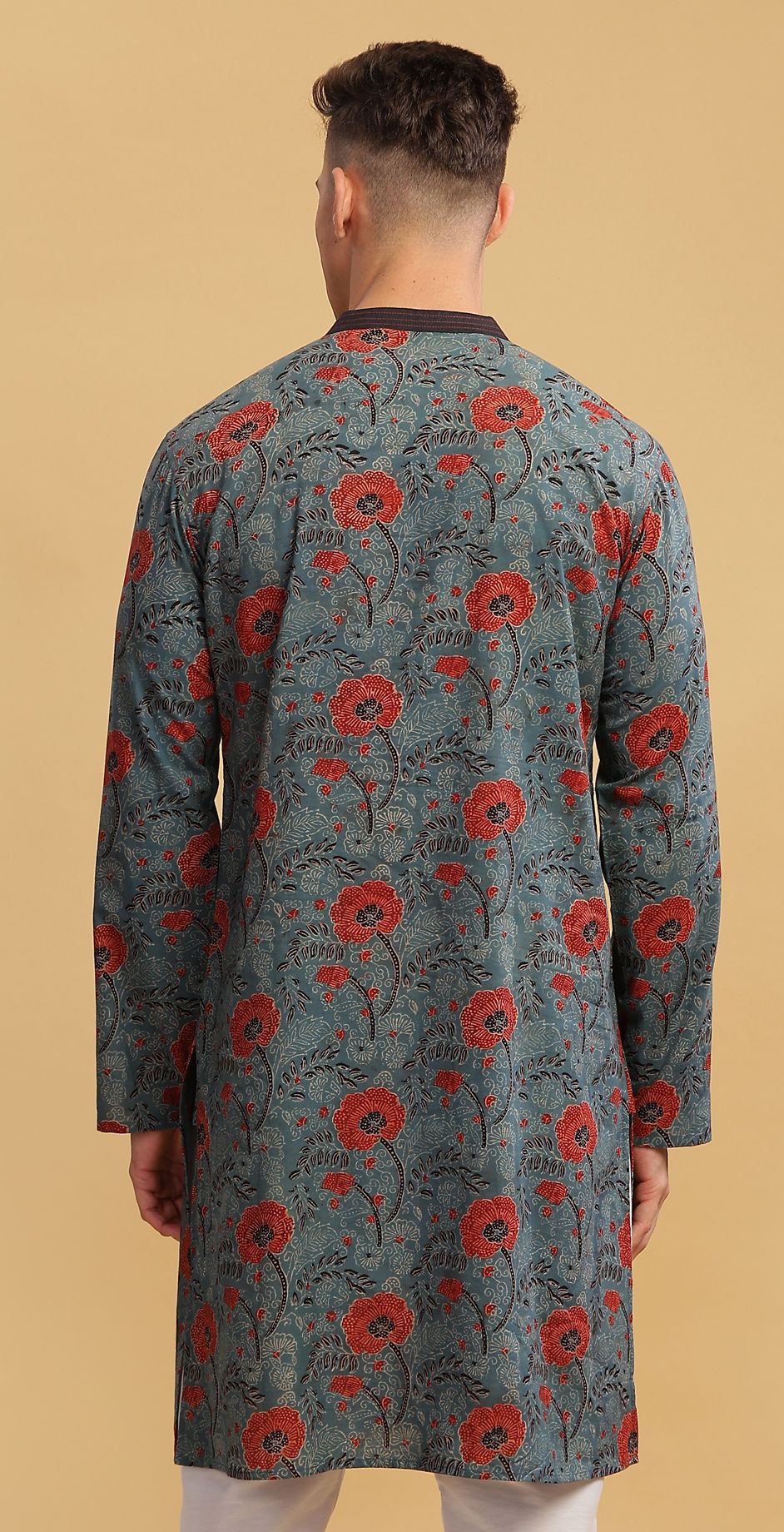 Cotton Party Wear Kurta in Black and Grey with Printed work