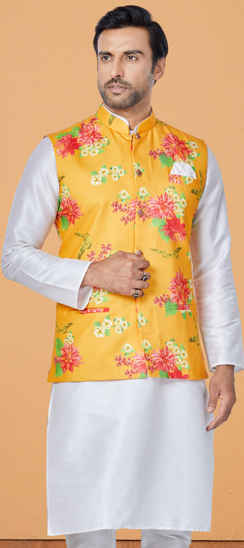 Cotton Party Wear Nehru Jacket in Yellow with Digital Print work