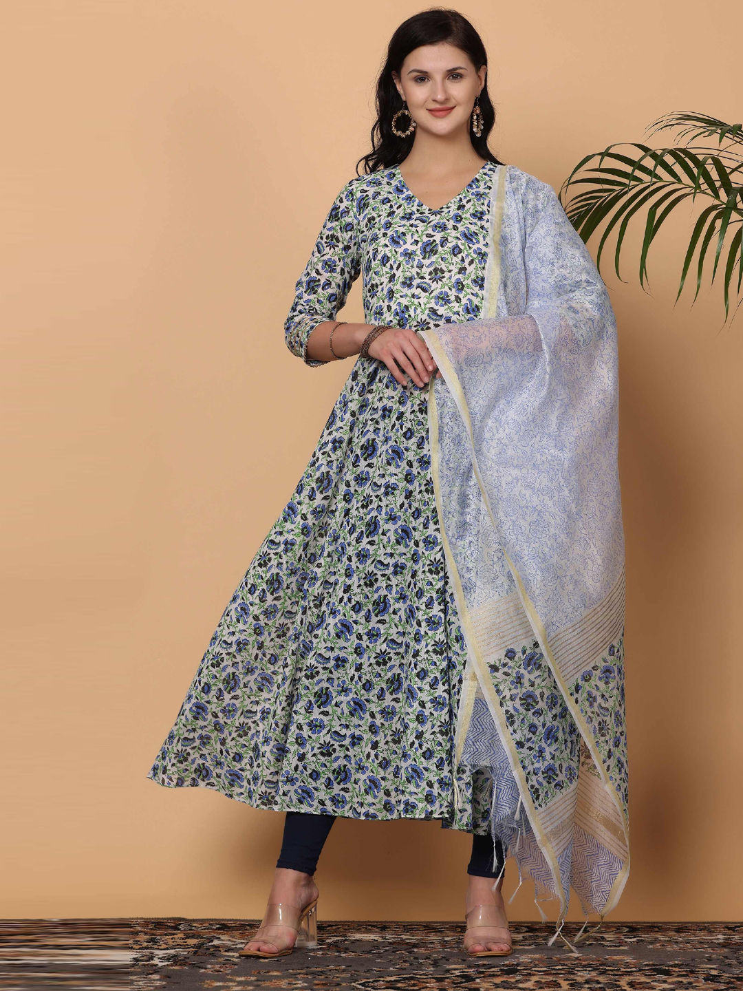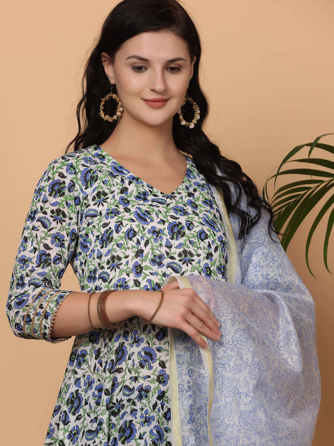 Blue, White and Off White color Salwar Kameez in Cotton fabric with Block Print work