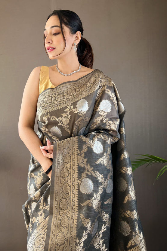 Black and Grey color Saree in Cotton fabric with Weaving, Zari work