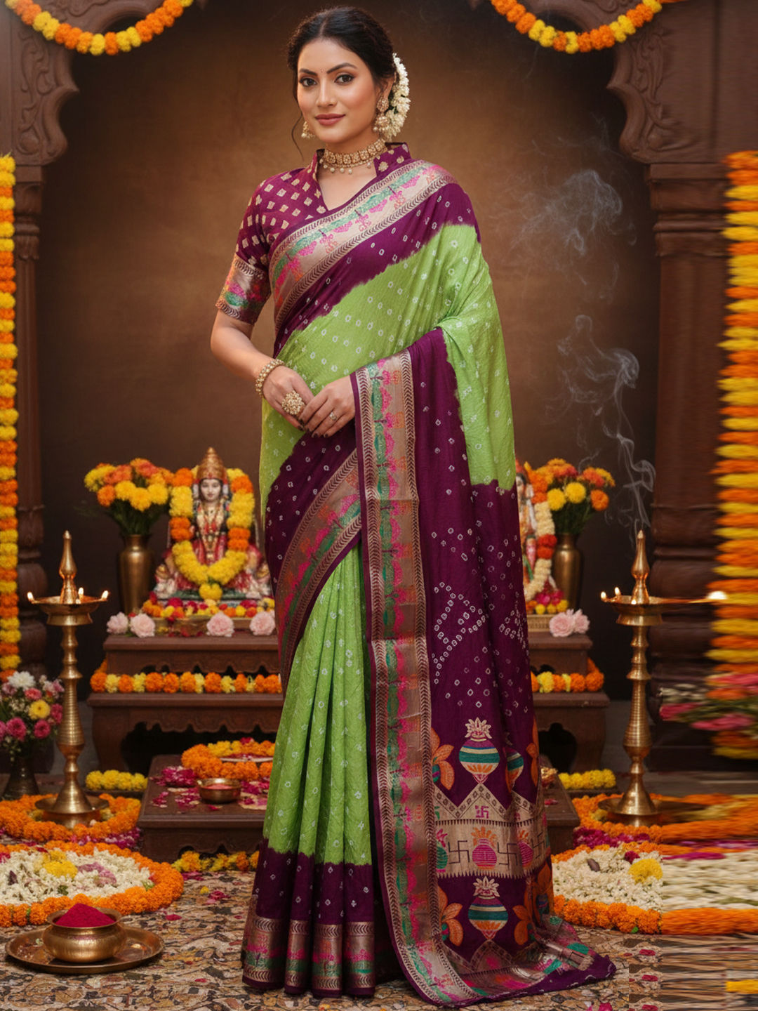 Green color Saree in Cotton fabric with Bandhej, Printed, Weaving work