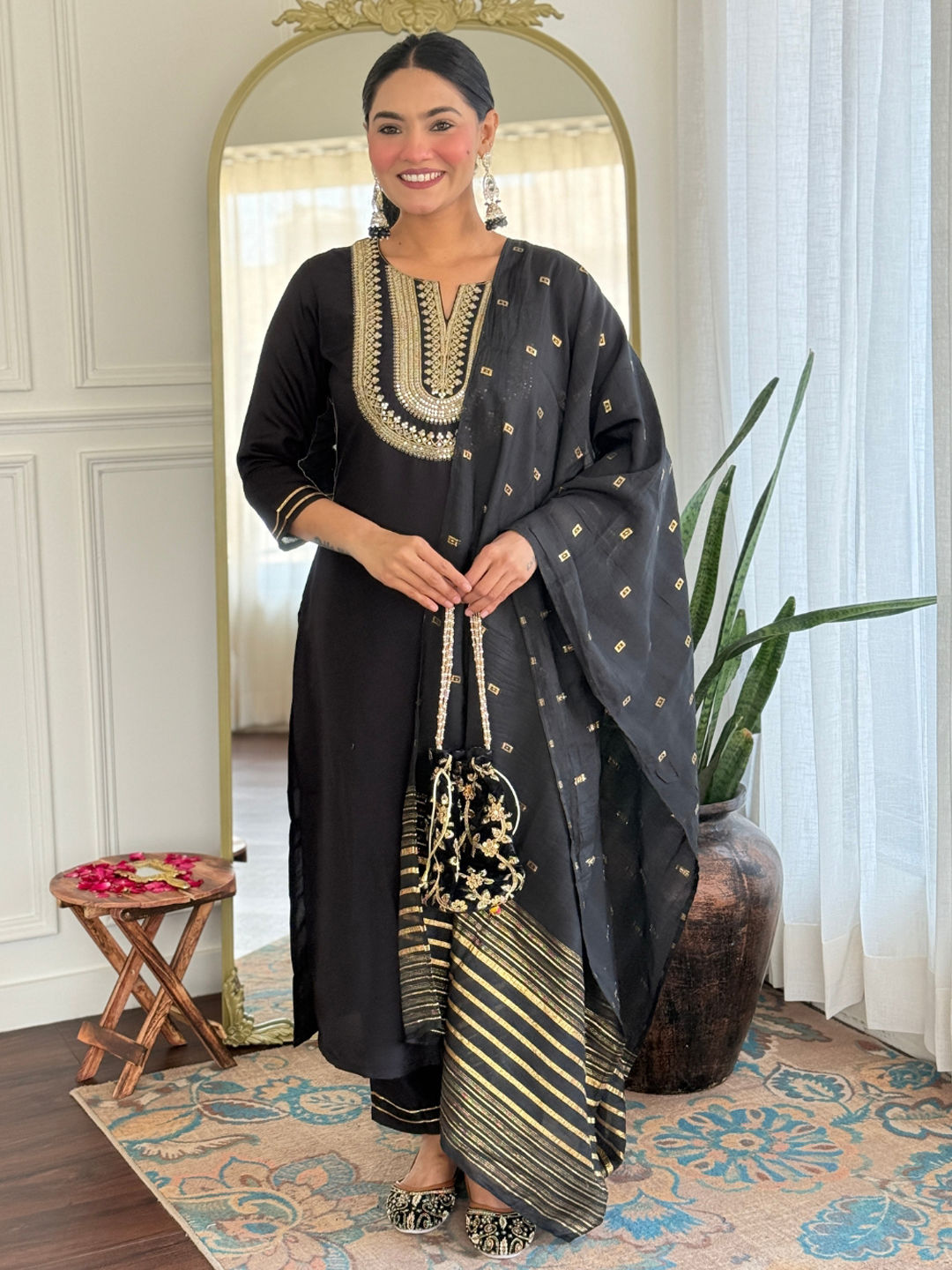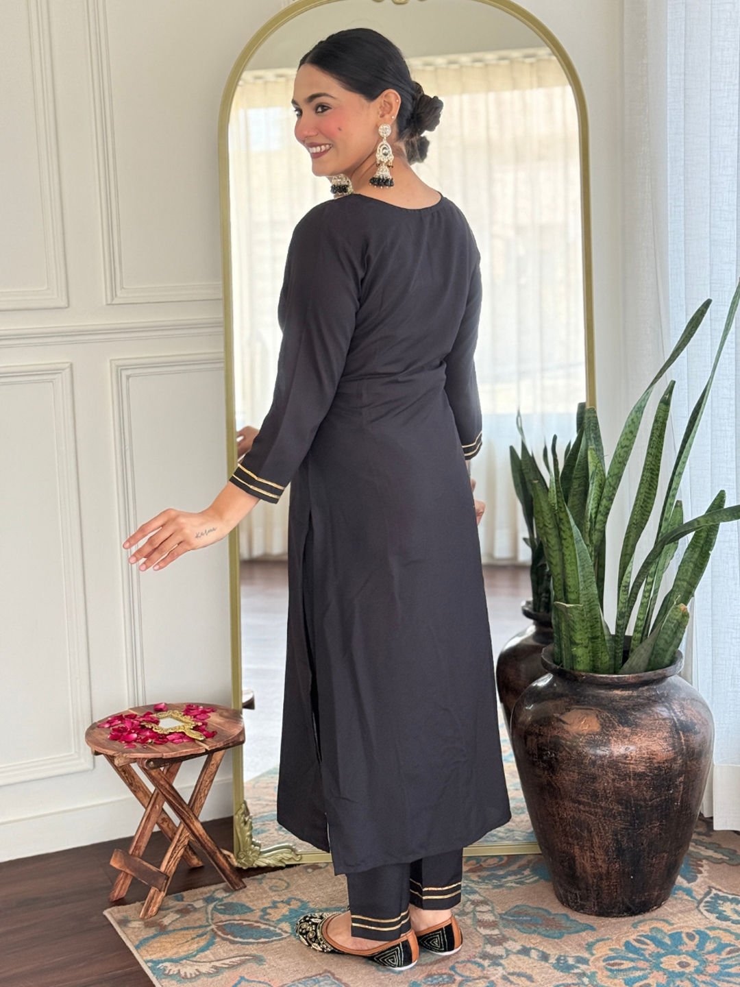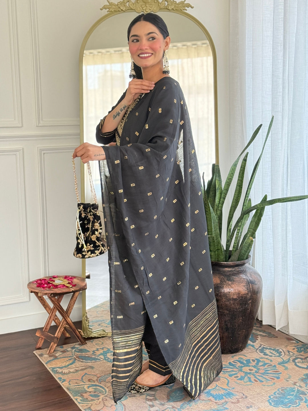 Black and Grey color Salwar Kameez in Cotton Slub fabric with Embroidered work
