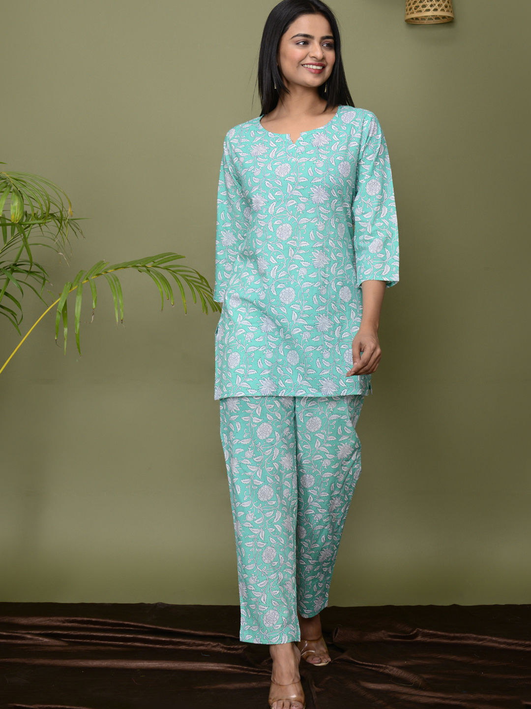 Green color Co-ords Set in Cotton fabric with Floral, Printed work