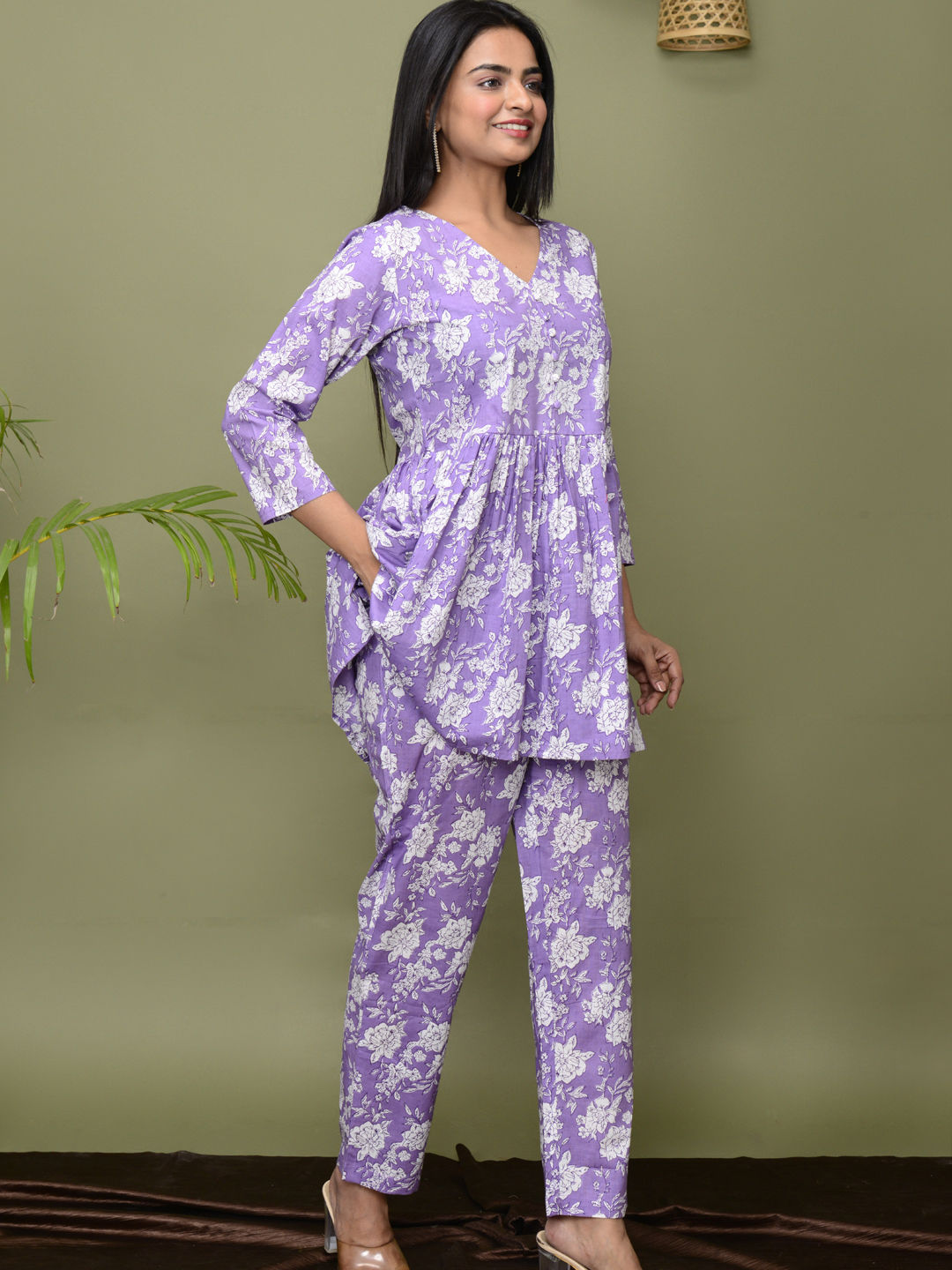 Purple and Violet color Co-ords Set in Cotton fabric with Floral, Printed work