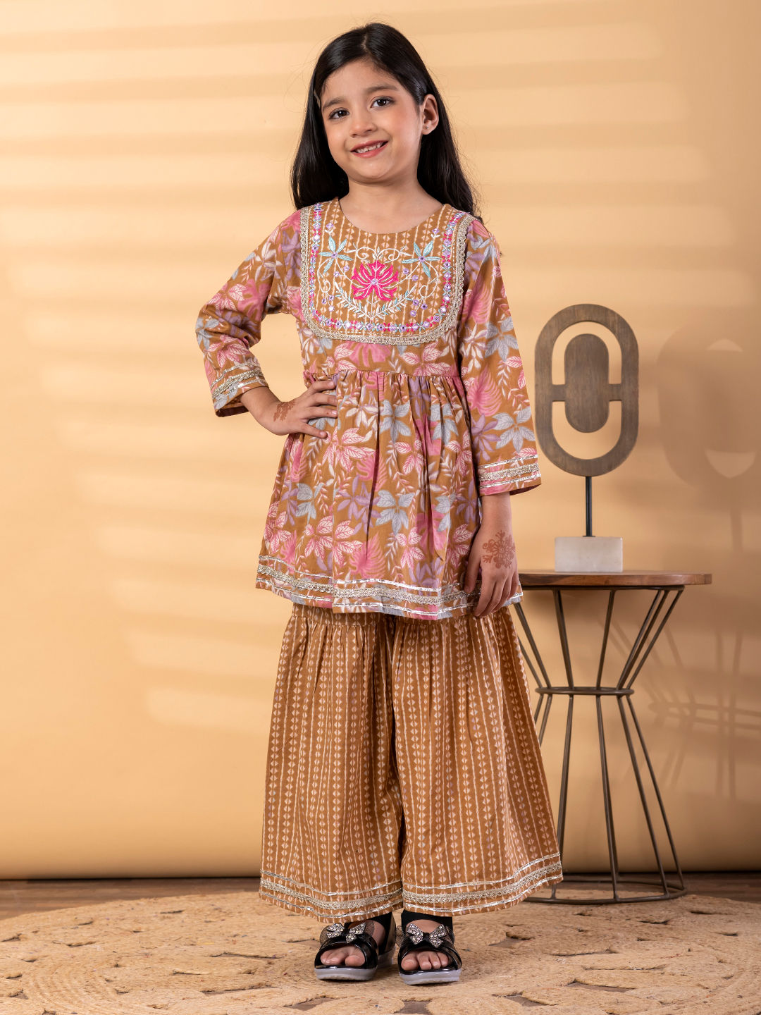 Beige and Brown color Girls Top with Bottom in Cotton fabric with Floral, Gota Patti, Printed work