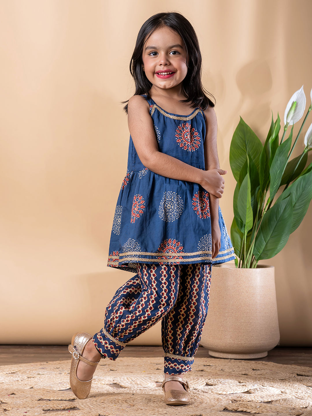 Blue color Girls Top with Bottom in Cotton fabric with Gota Patti, Printed work