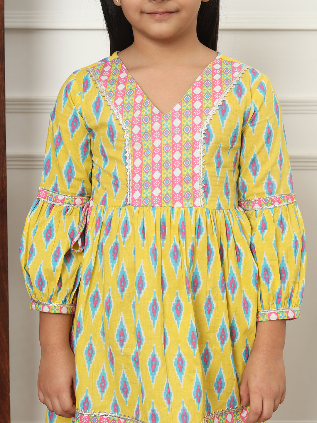 Cotton Summer Girls Top with Bottom in Yellow with Printed work