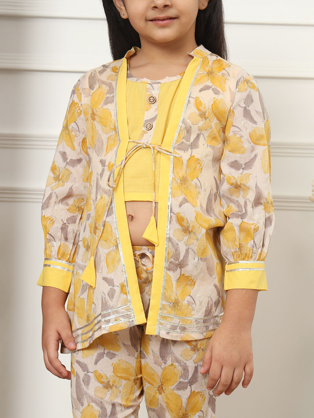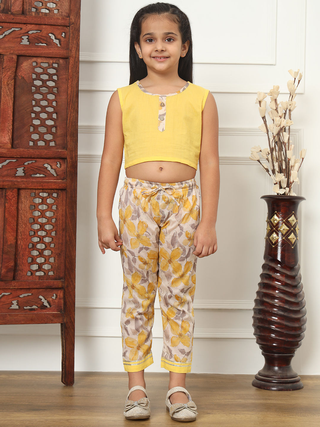 Beige and Brown, Yellow color Girls Top with Bottom in Cotton fabric with Gota Patti, Printed work