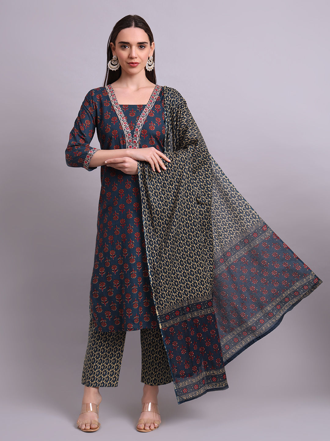 Blue color Salwar Kameez in Cotton fabric with Embroidered, Floral, Printed, Resham, Thread work