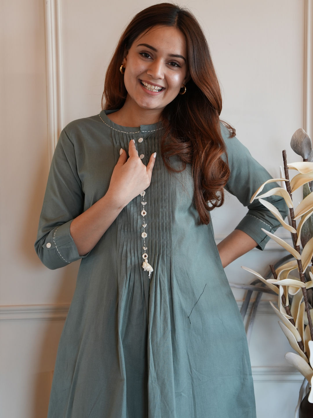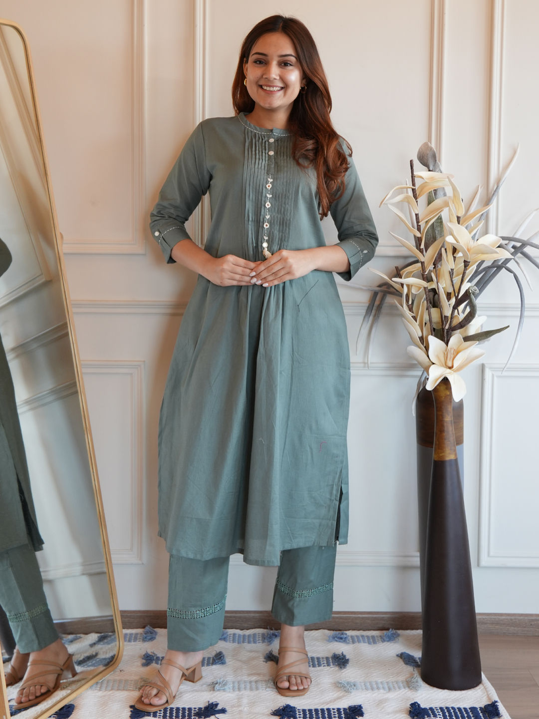 Green color Salwar Kameez in Cotton fabric with Pleats work