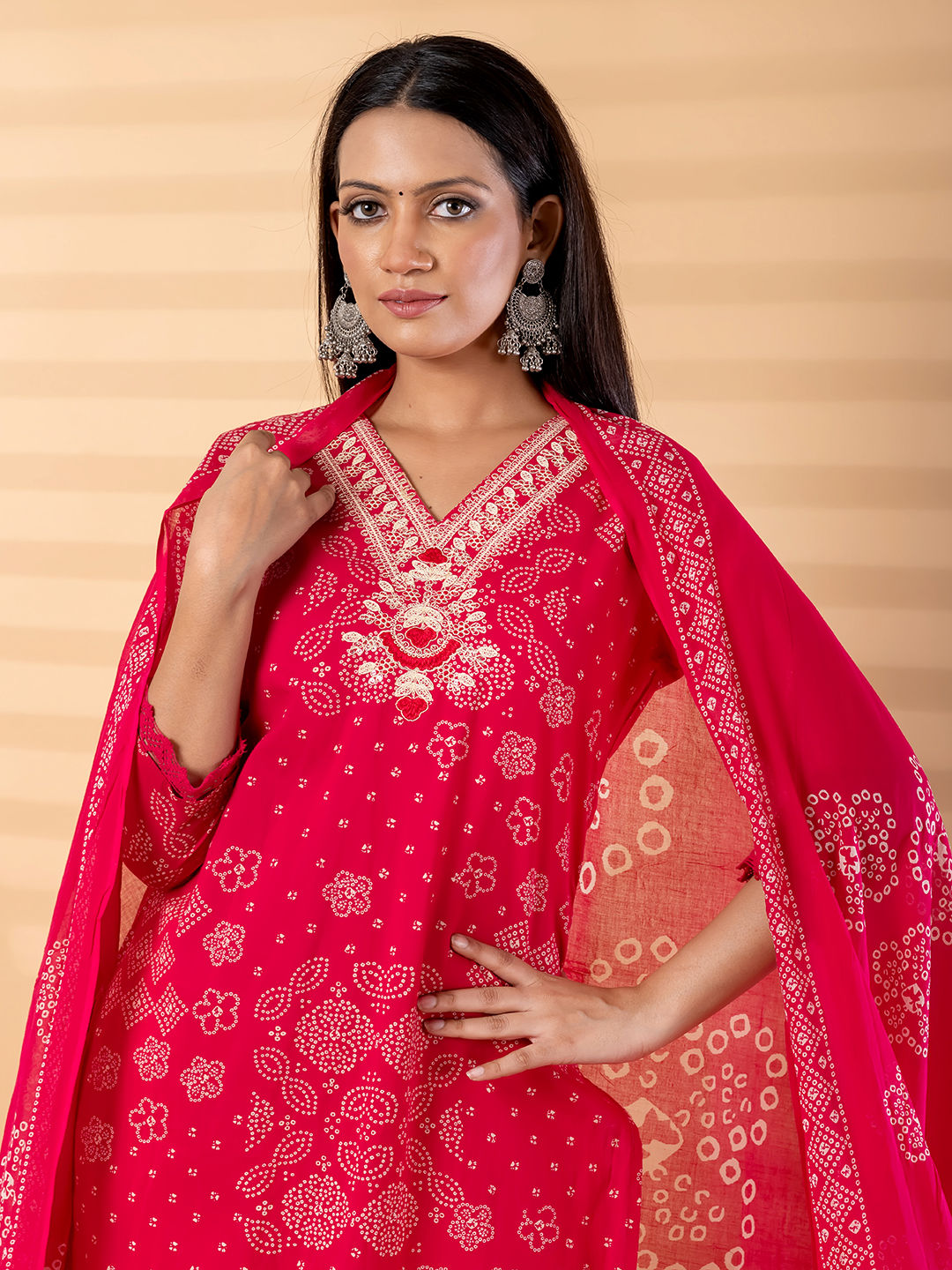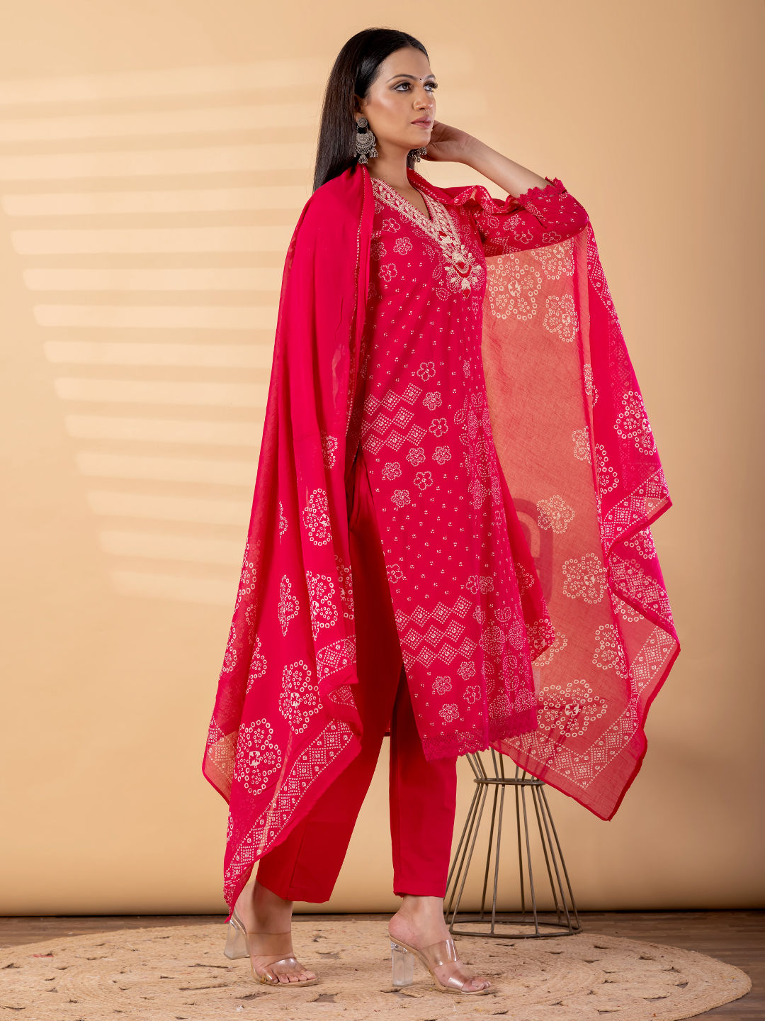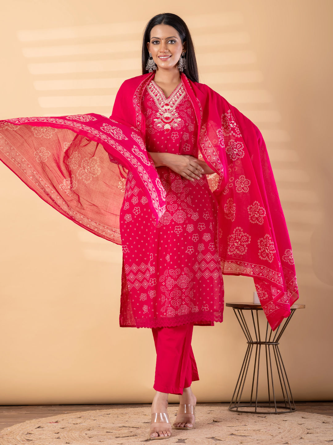 Pink and Majenta color Salwar Kameez in Cotton fabric with Bandhej, Embroidered, Printed work