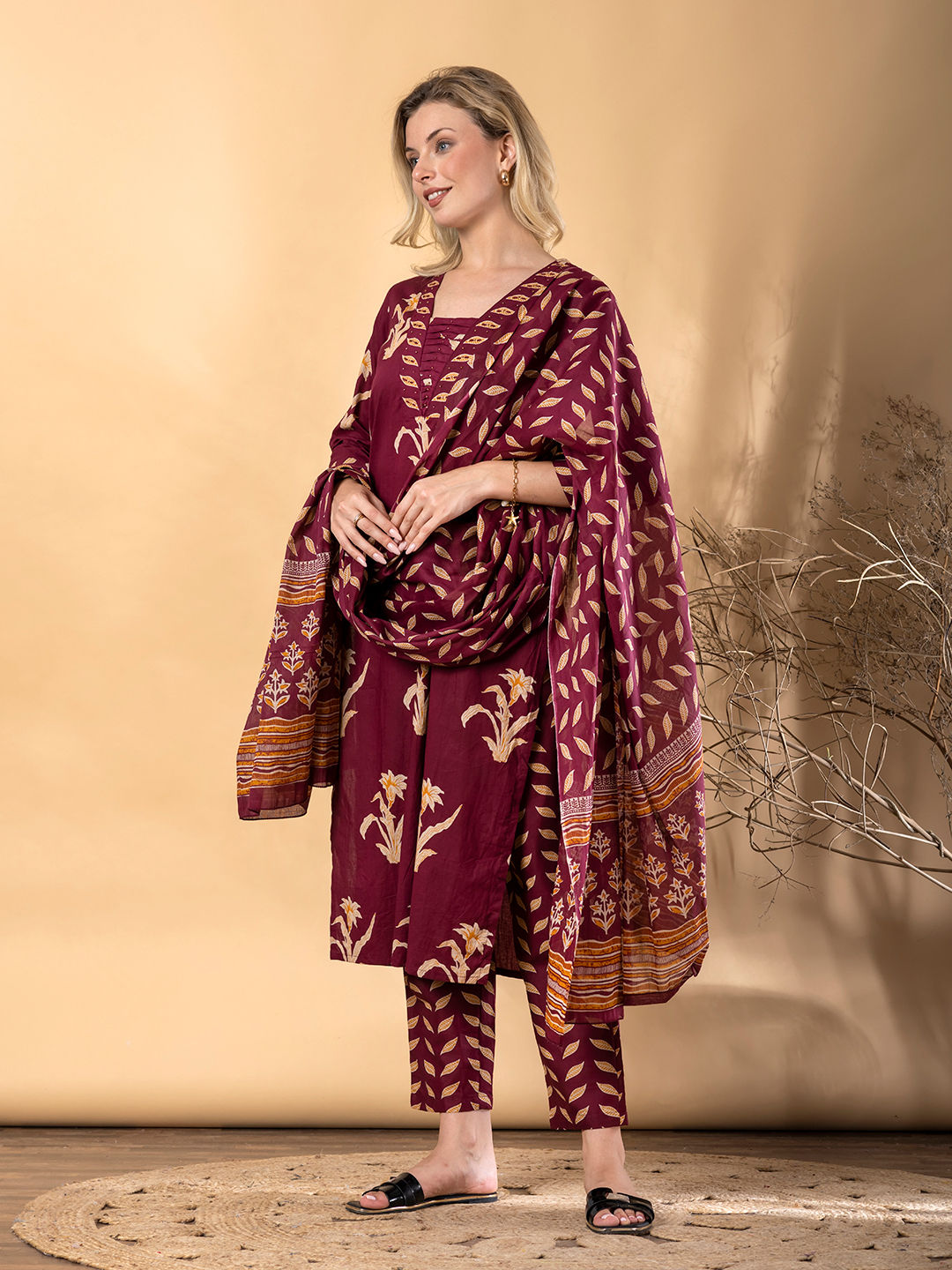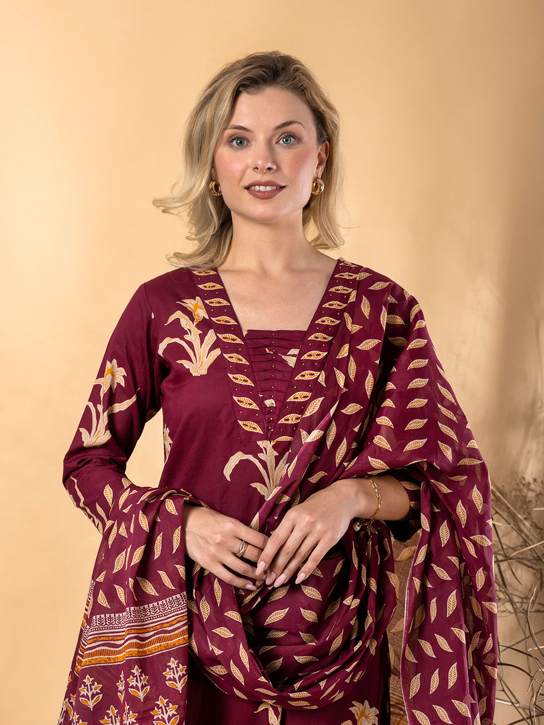 Red and Maroon color Salwar Kameez in Cotton fabric with Bugle Beads, Floral, Printed work