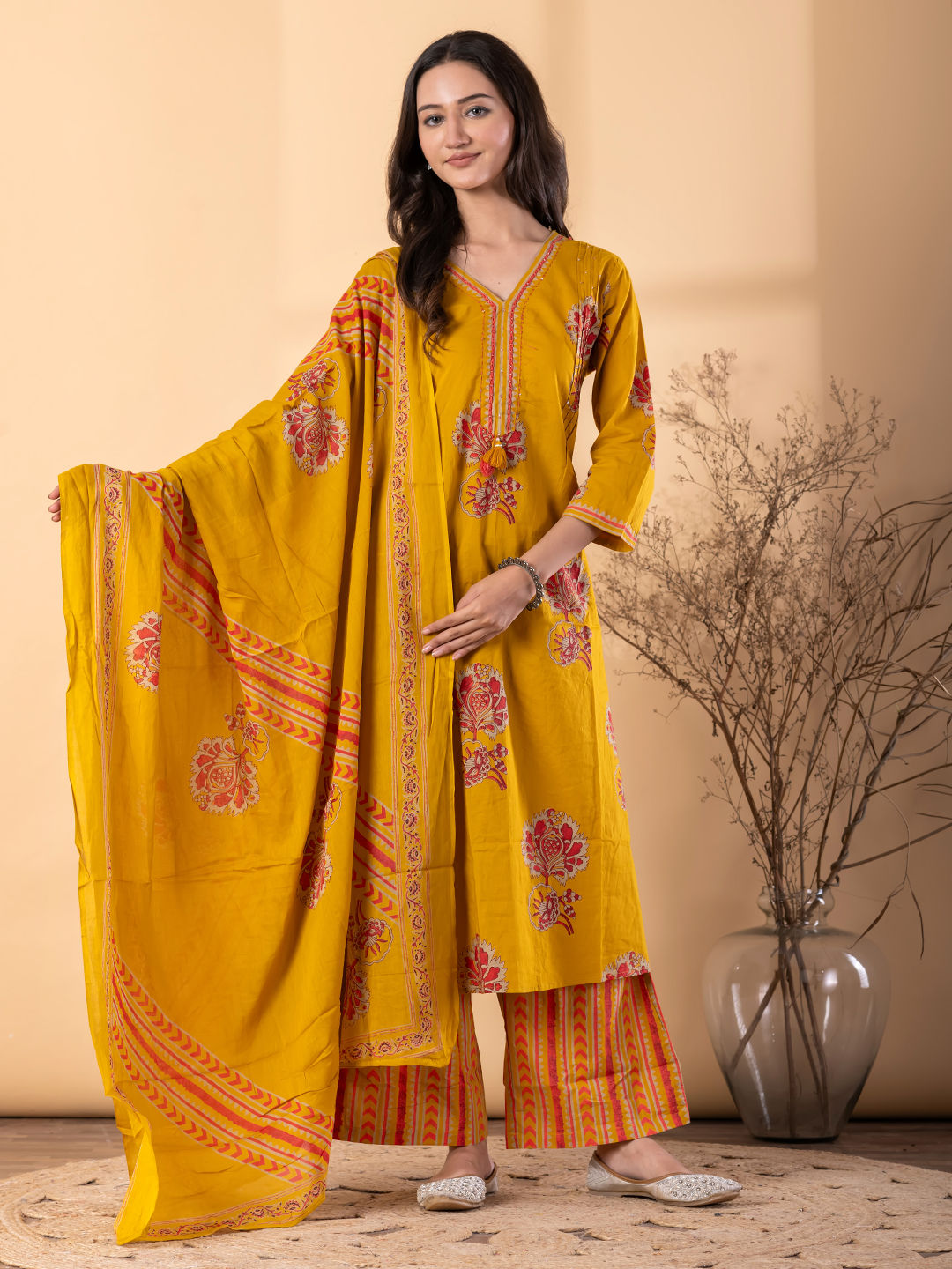 Yellow color Salwar Kameez in Cotton fabric with Floral, Printed, Sequence, Thread work