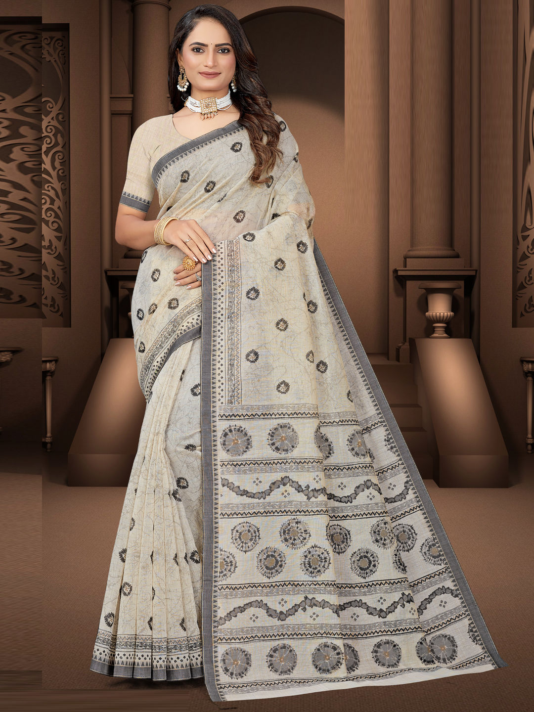 Cotton Traditional Saree in Beige and Brown with Printed work