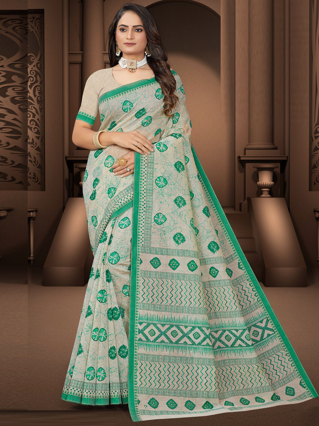 Cotton Traditional Saree in Beige and Brown with Printed work