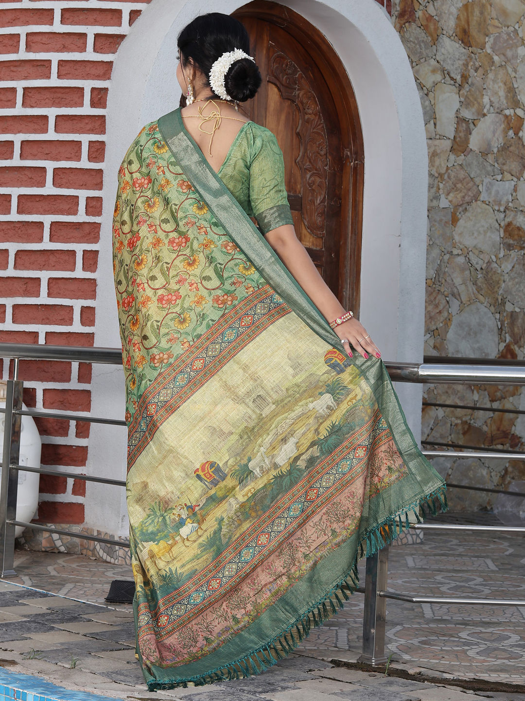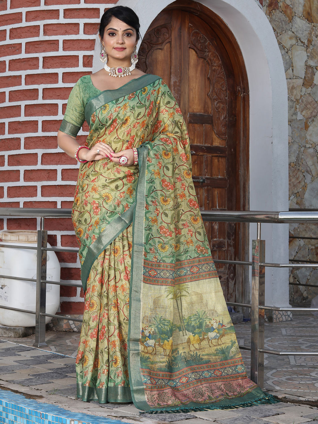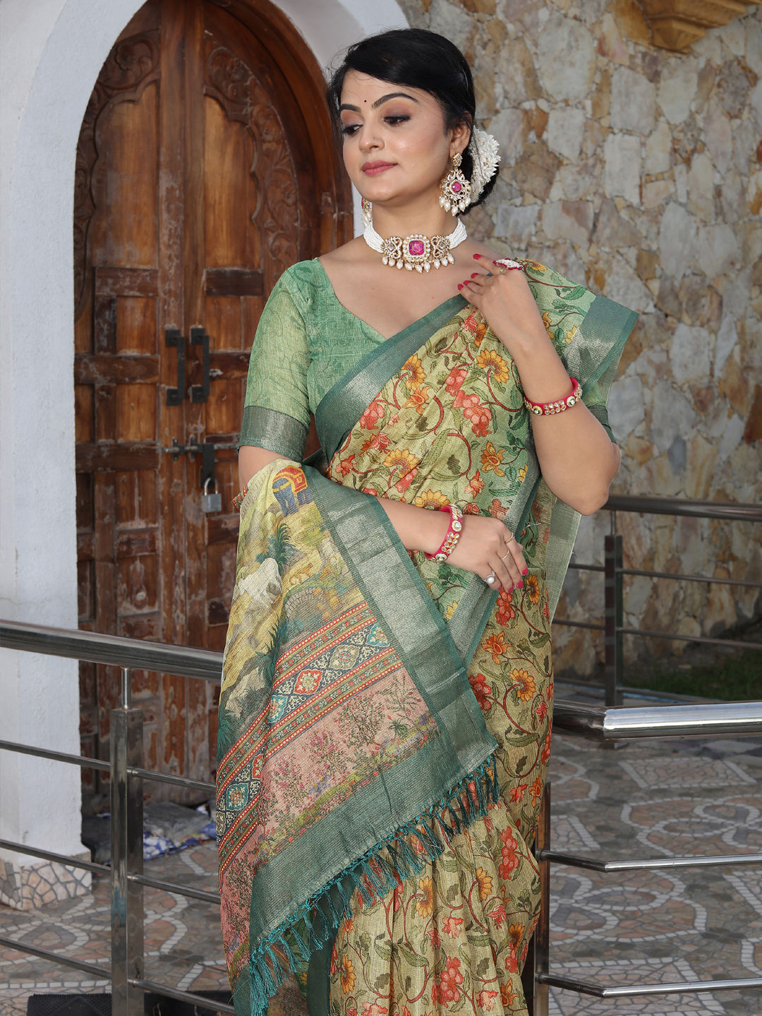 Beige and Brown color Saree in Cotton, Shimmer fabric with Floral, Printed, Weaving work