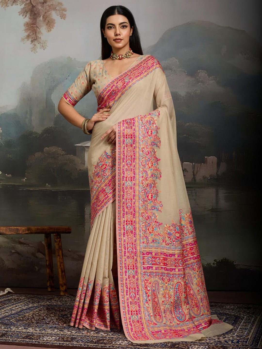 Beige and Brown color Saree in Cotton fabric with Printed work
